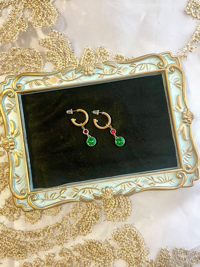 アート作品〝SENSE〟のピアスをアクセサリーとして制作しました。 エメラルドのスワロフスキーには細かなカットがたくさん入っており、 揺らめく度に光を反射して美しいエメラルドグリーンの煌めきを放ちます。 ゴールドとレッド、エメラルドの組み合わせで流行に左右されないデザインですのでどんな場面でもその人らしさを際立たせ豊かな彩りを添えます。 シンプルなファッションに合わせればポイントになり、 カラーを合わせたファッションにはより個性を際立たせます。 The artwork "SENSE" earrings were created as accessories. The emerald Swarovski has many fine cuts and reflects the light every time it shimmers, giving off a beautiful emerald green shimmer. The combination of gold, red, and emerald is a design that will never go out of style, so it will accentuate your personality and add a rich touch of color to any occasion. It will become a point of interest when worn with simple fashions, and it will become more personal when worn with colorful fashions. ✴︎size...全長4㎝