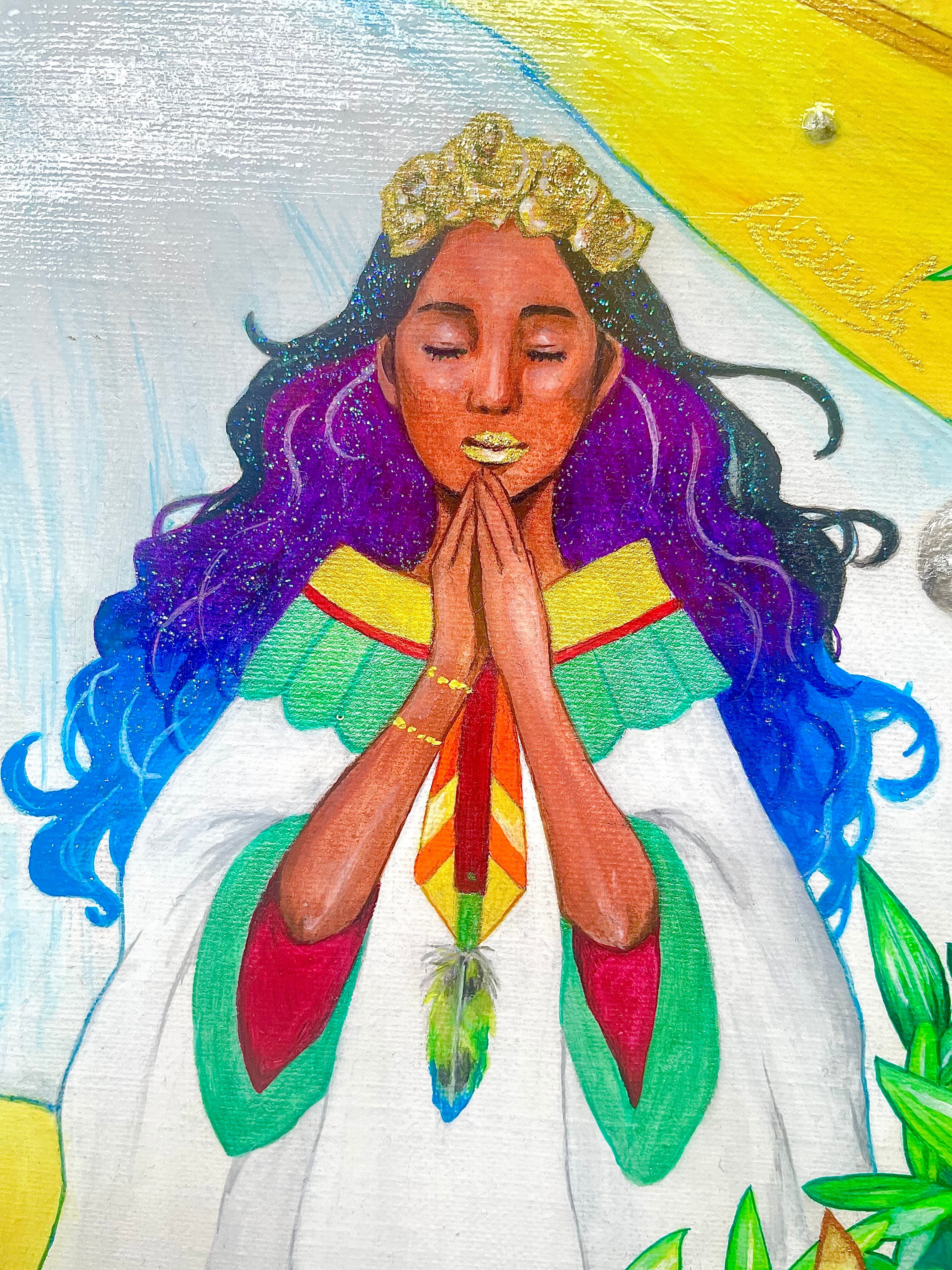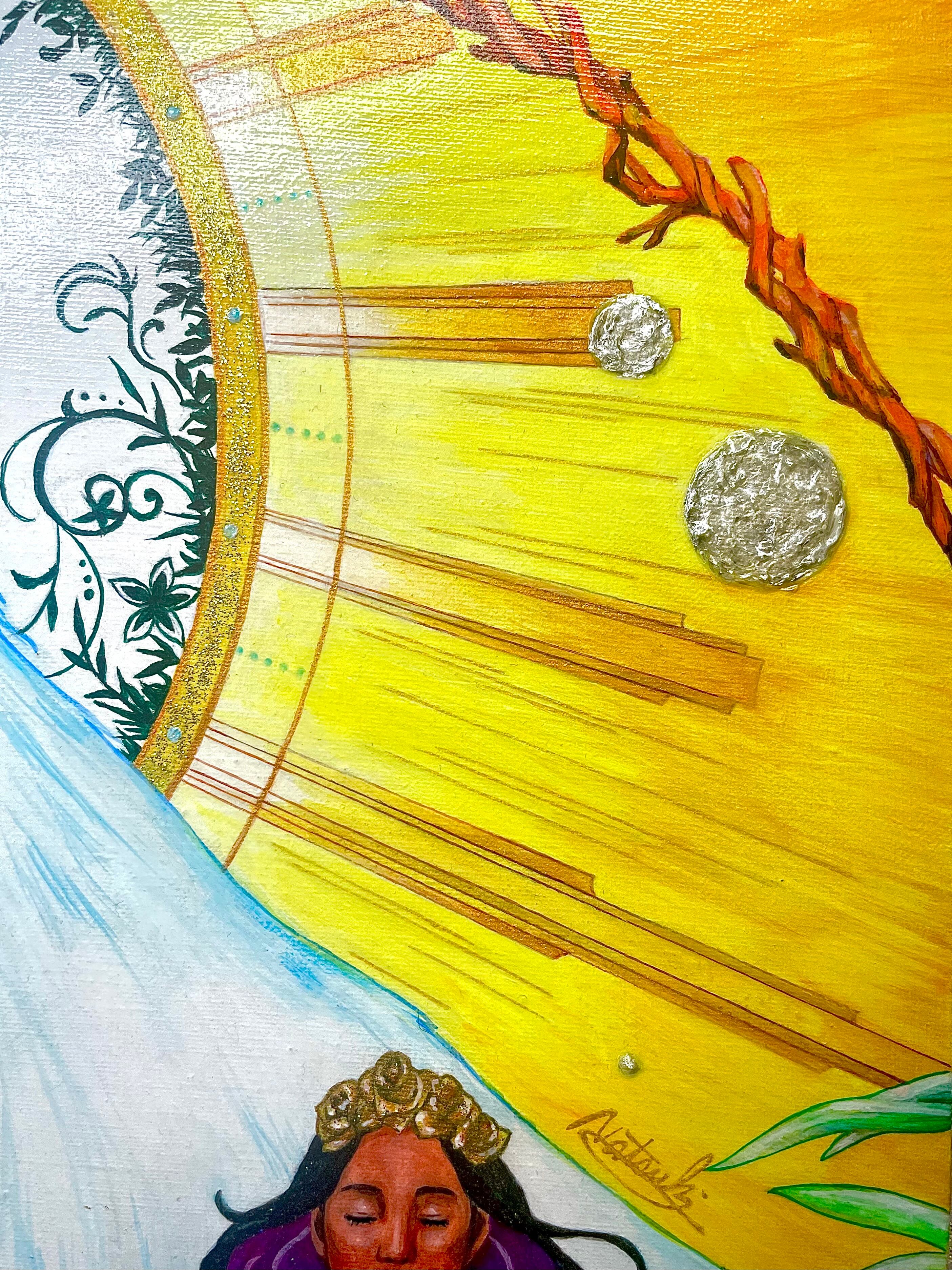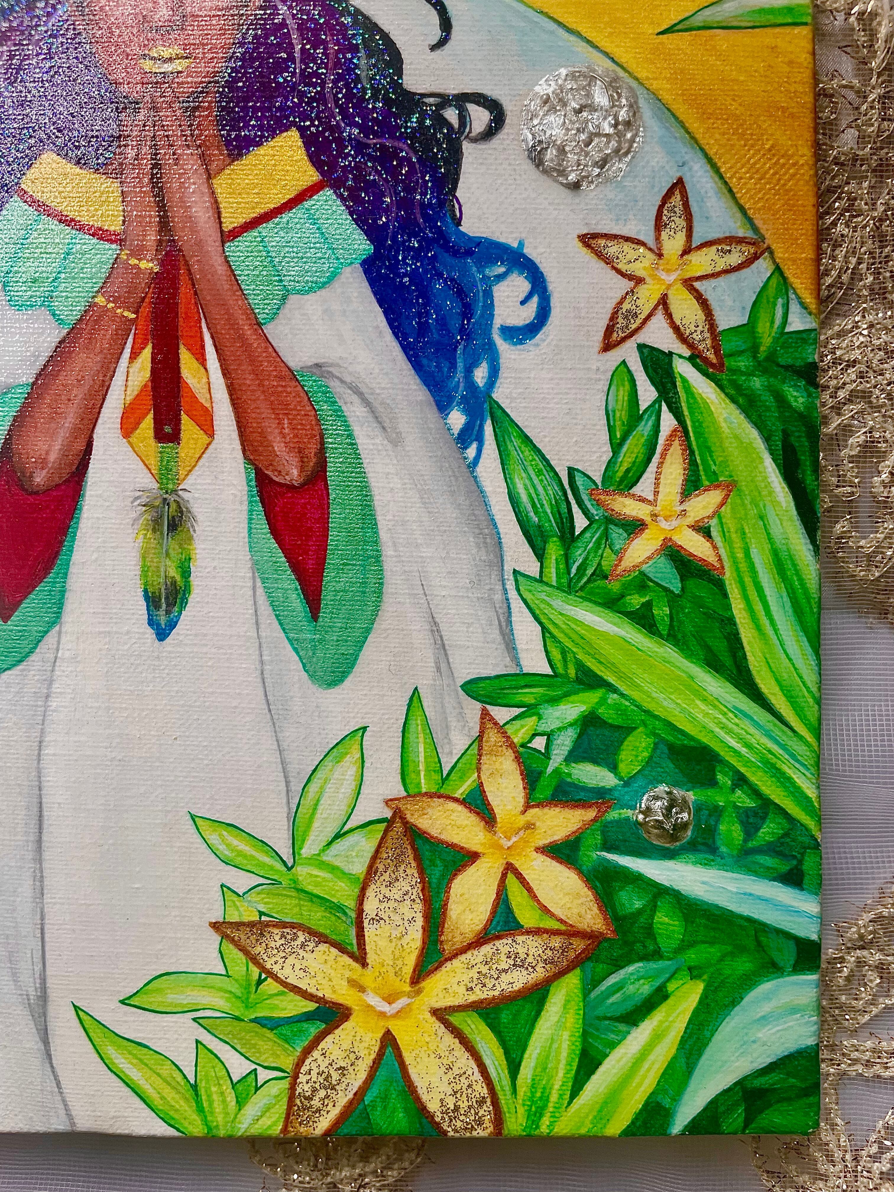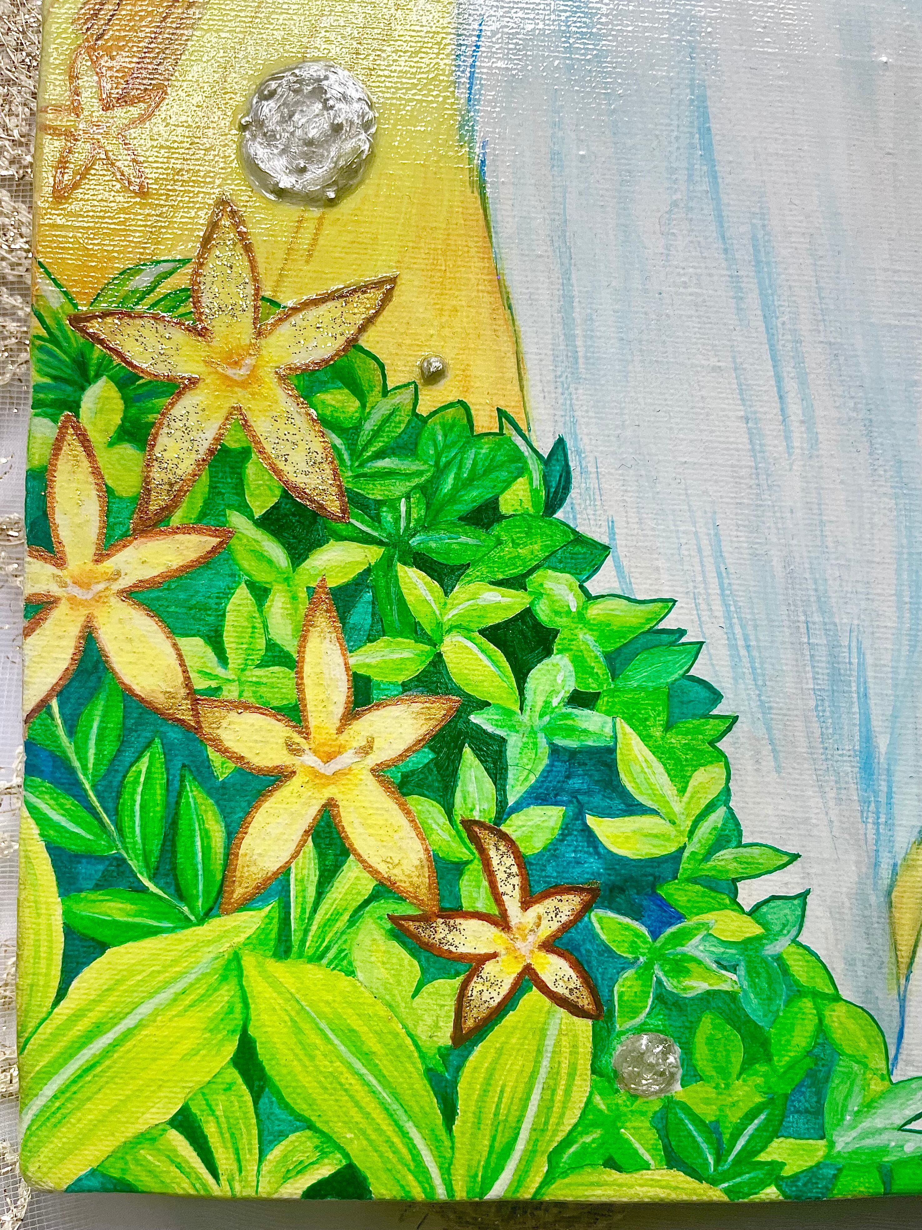 周りに漂う銀の球体にはジェルメディウムを使用しており、立体的に見えます。
