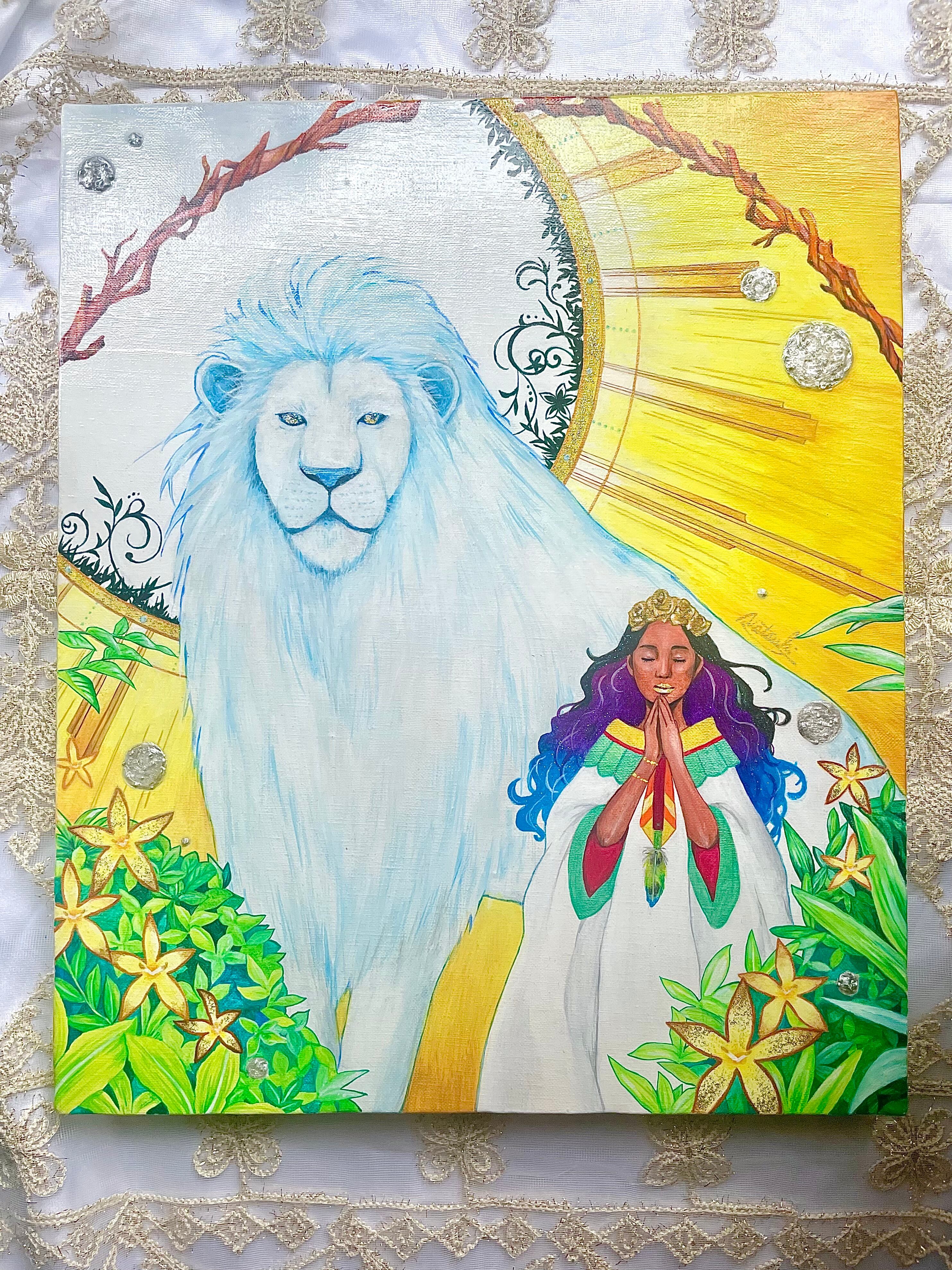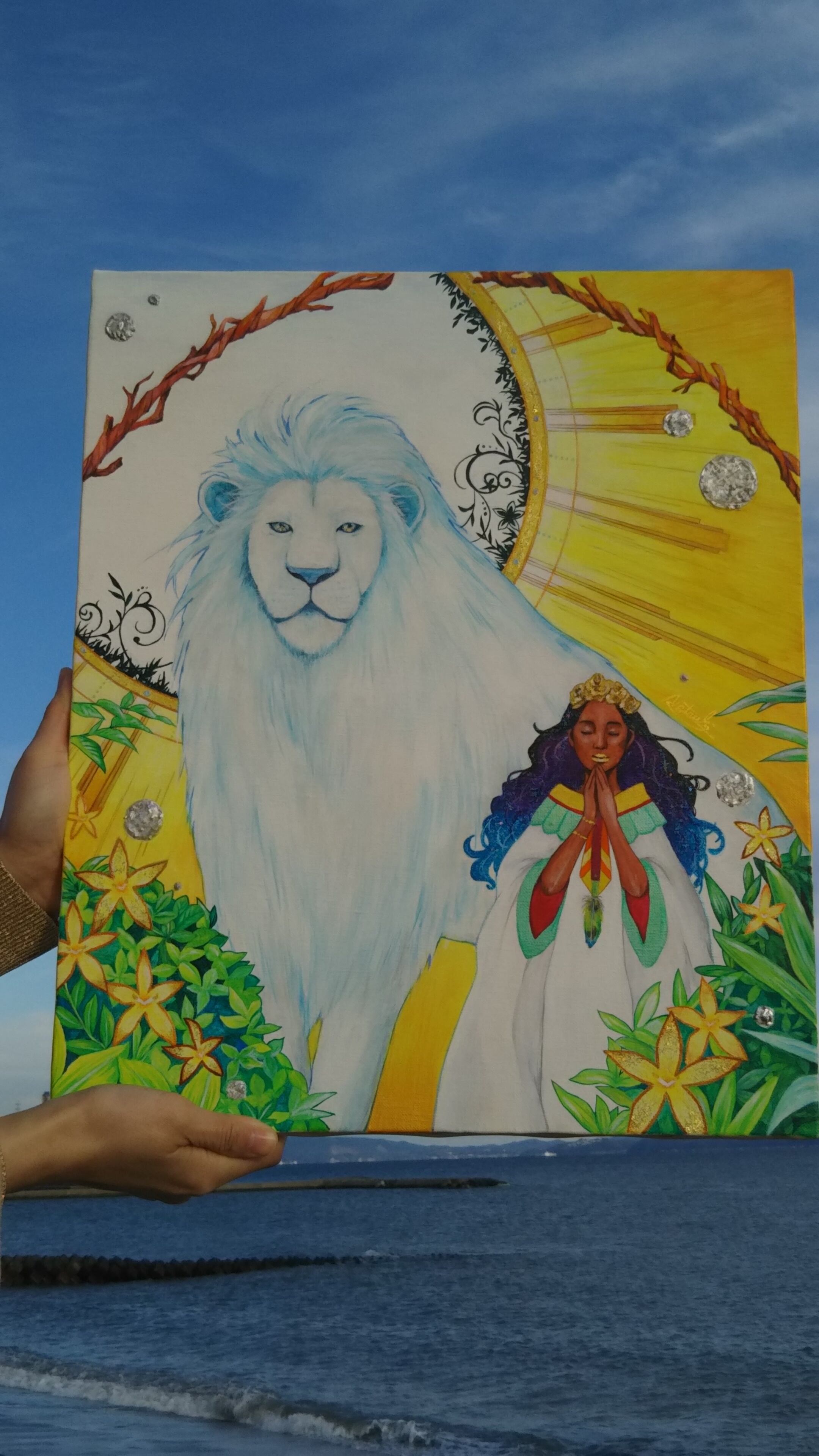 神秘的な威厳のあるホワイトライオンと、エジプト風の祈りを捧げる少女の絵です。