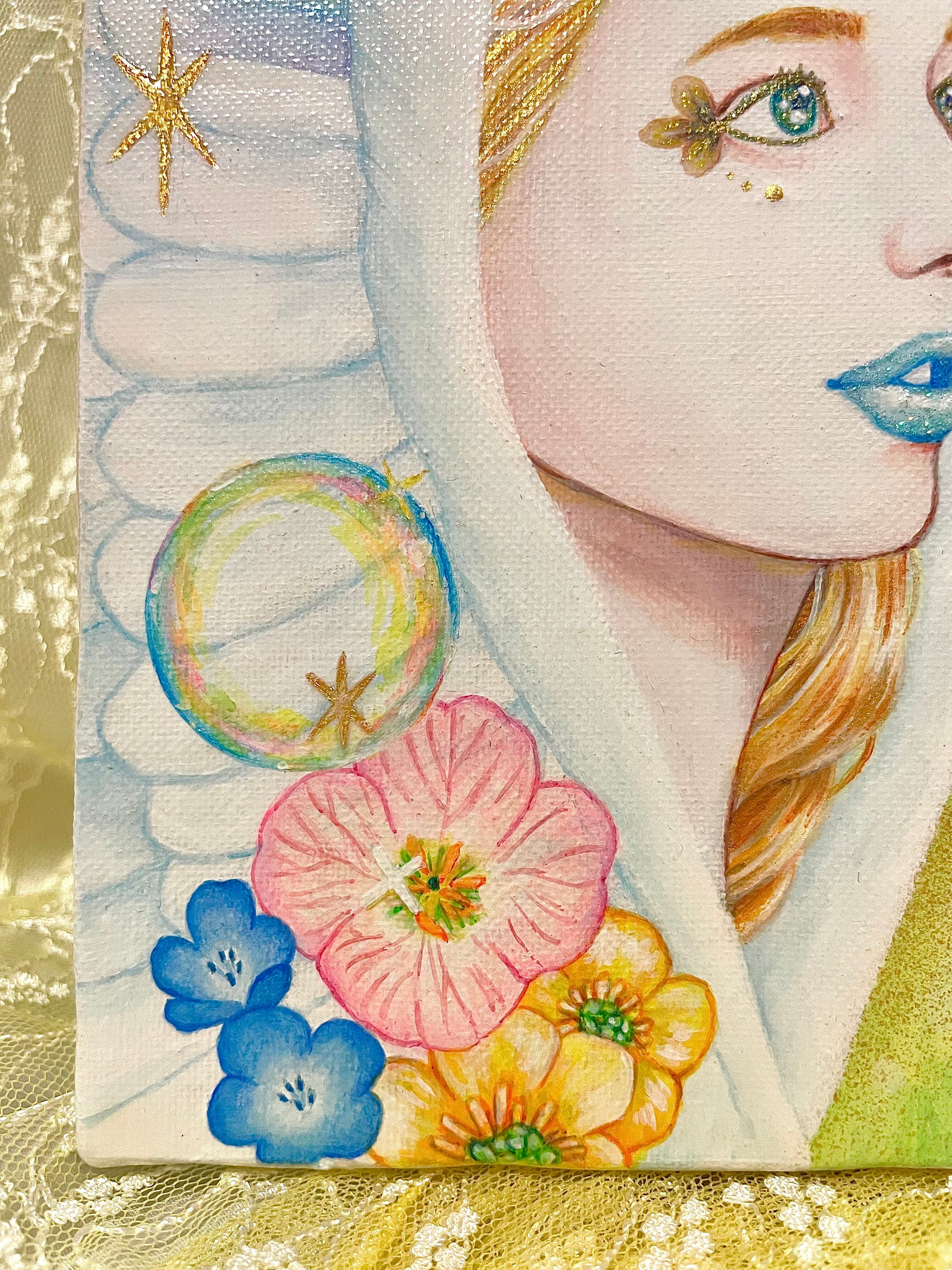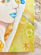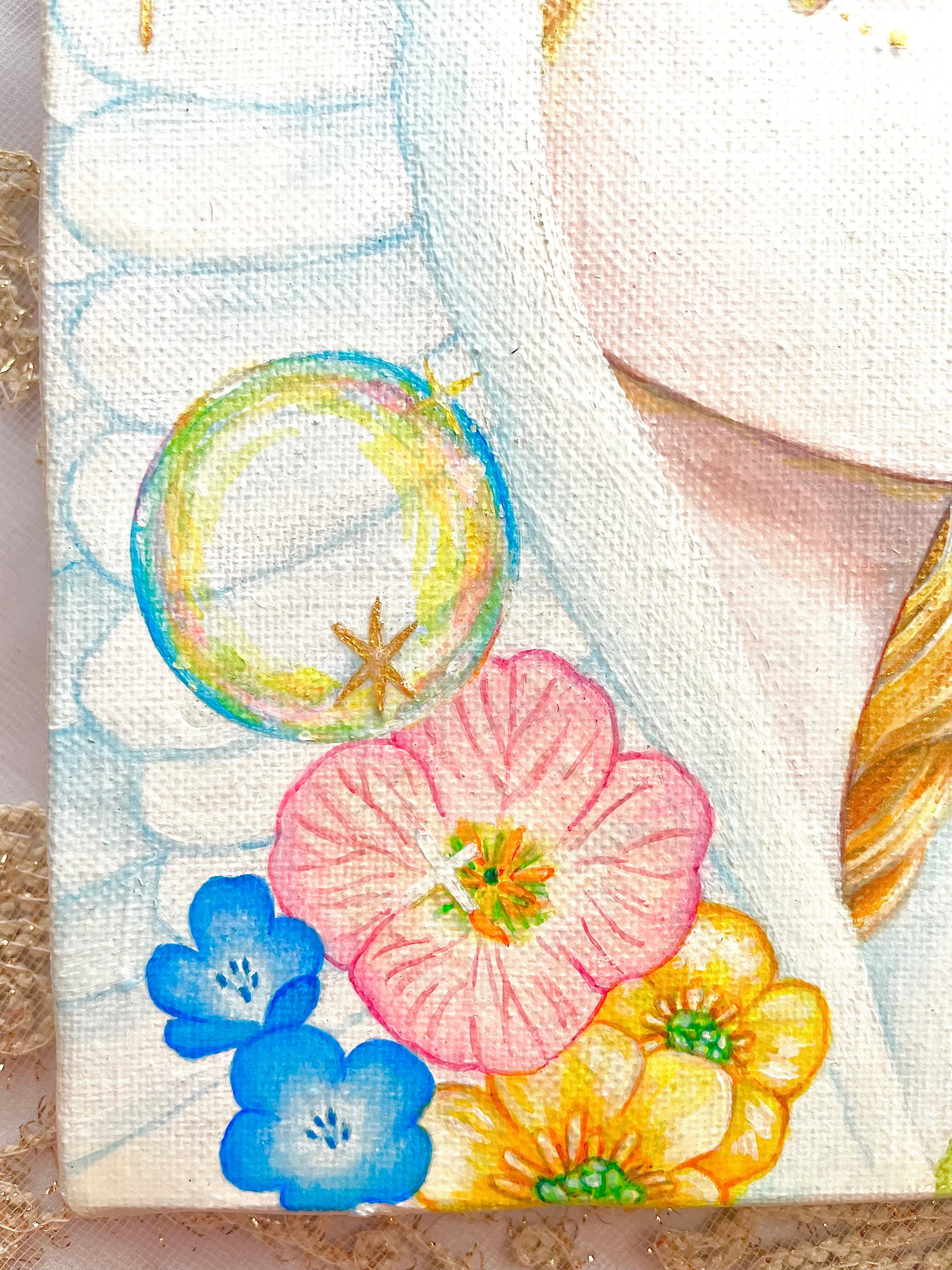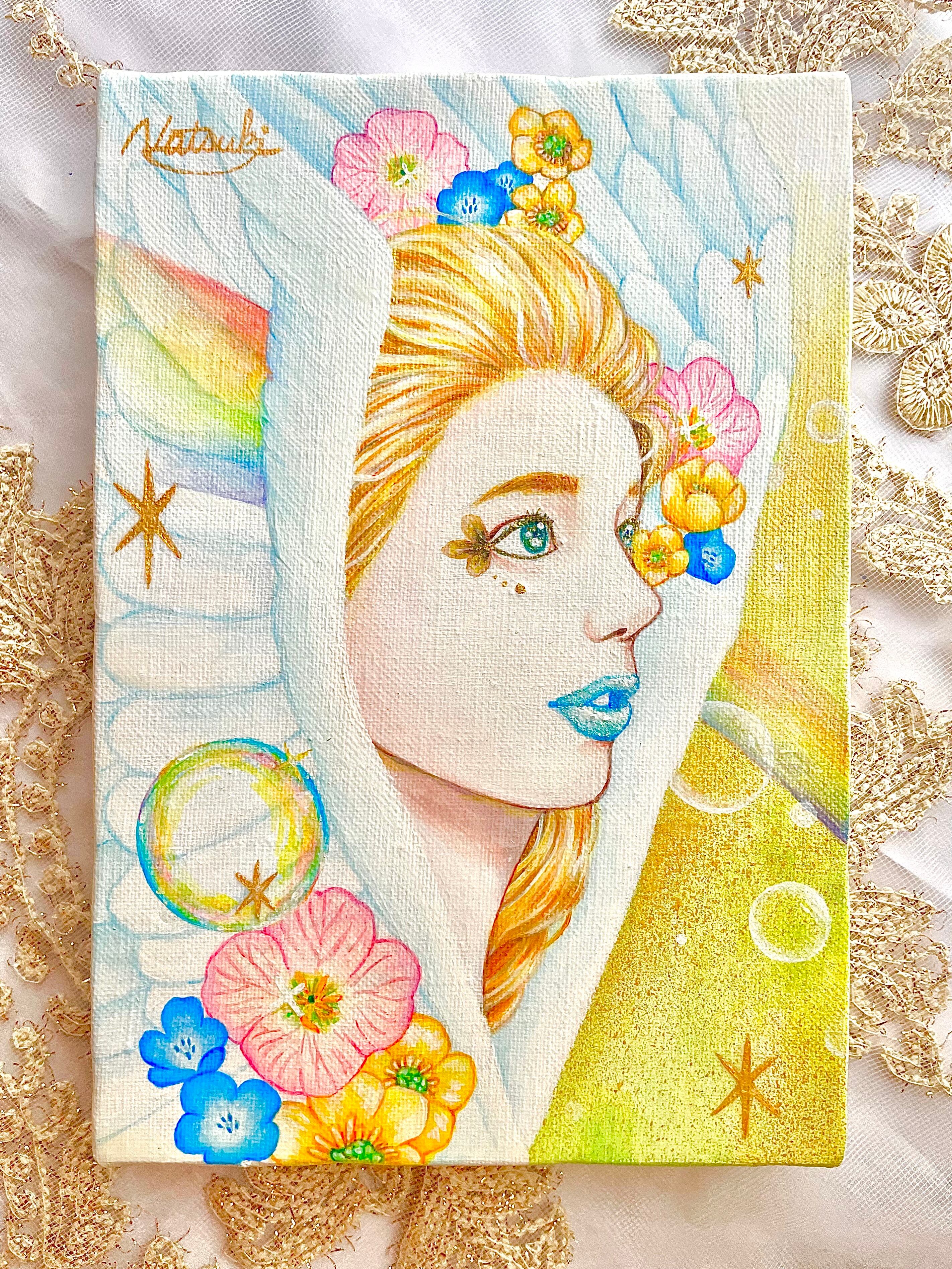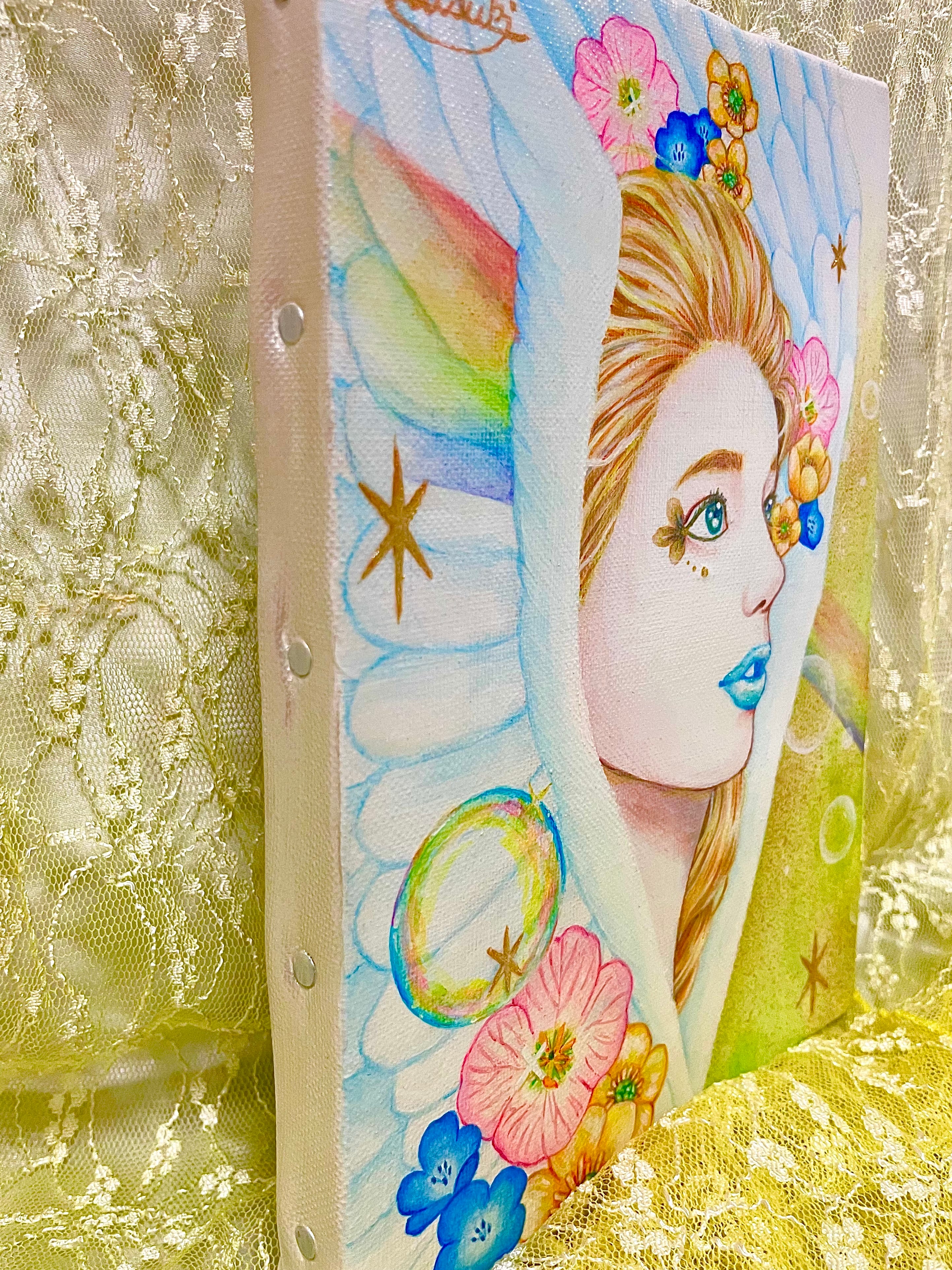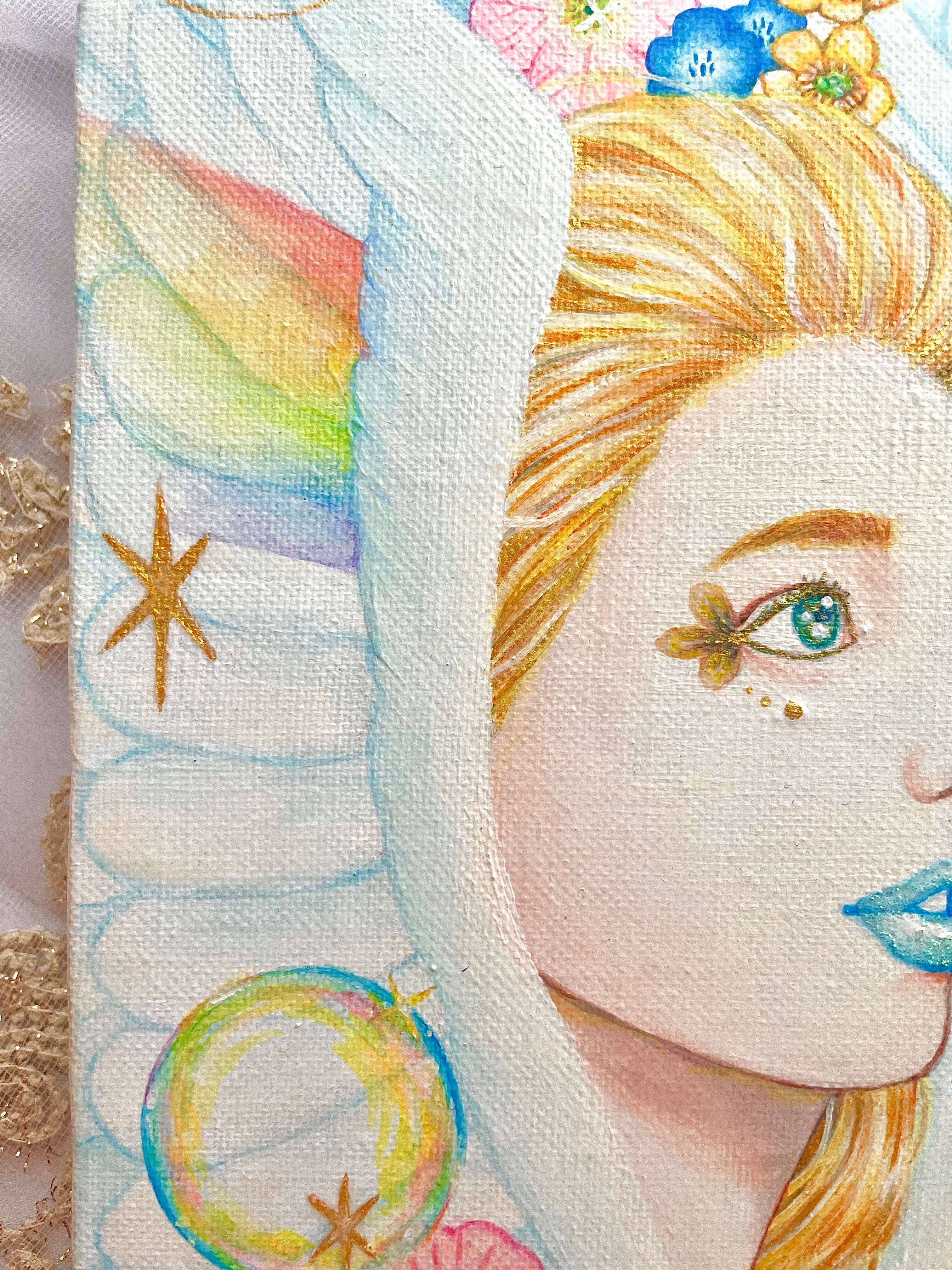天使の周りのキラキラ✴︎にはジェルメディウムを使用しており、立体感を出しています。