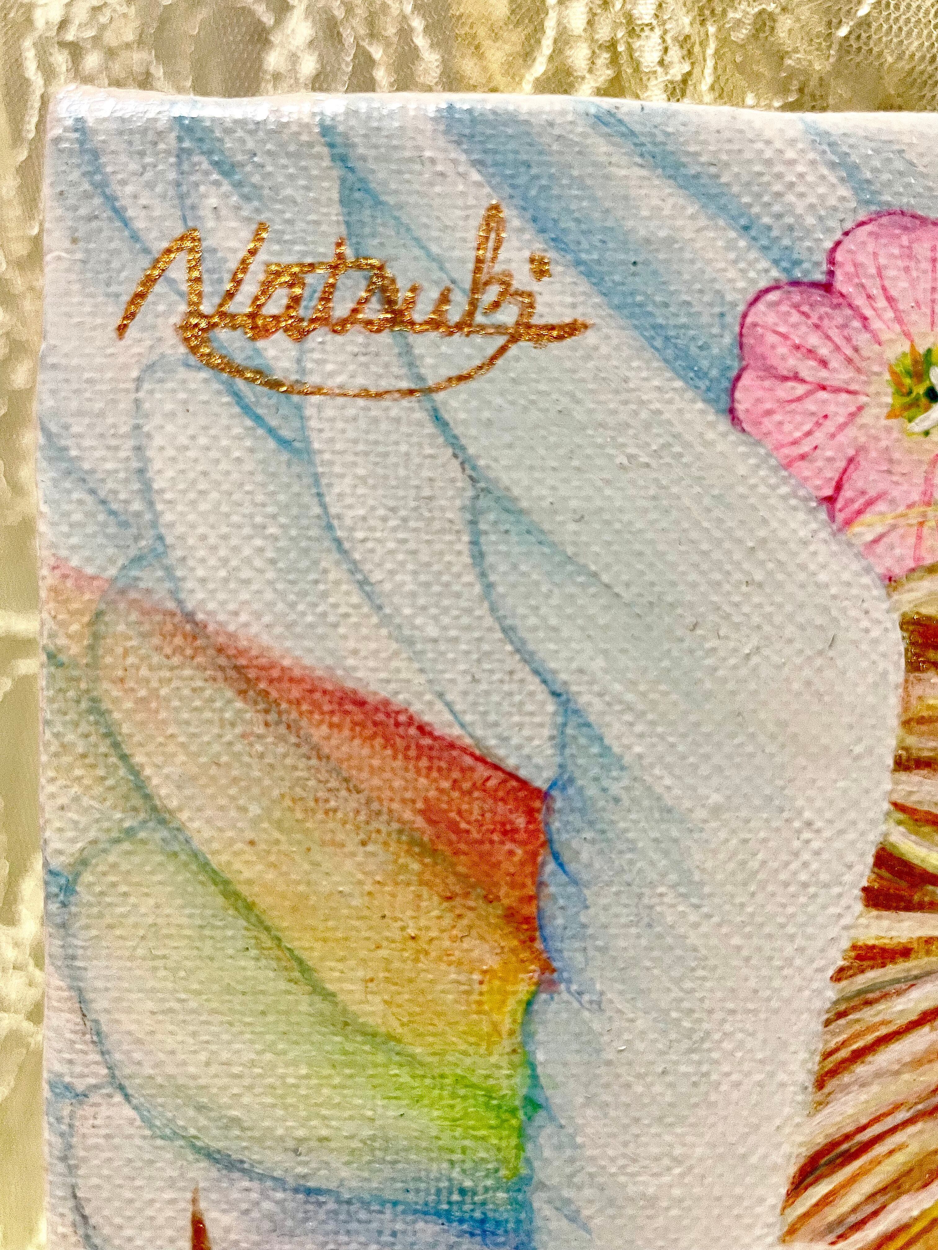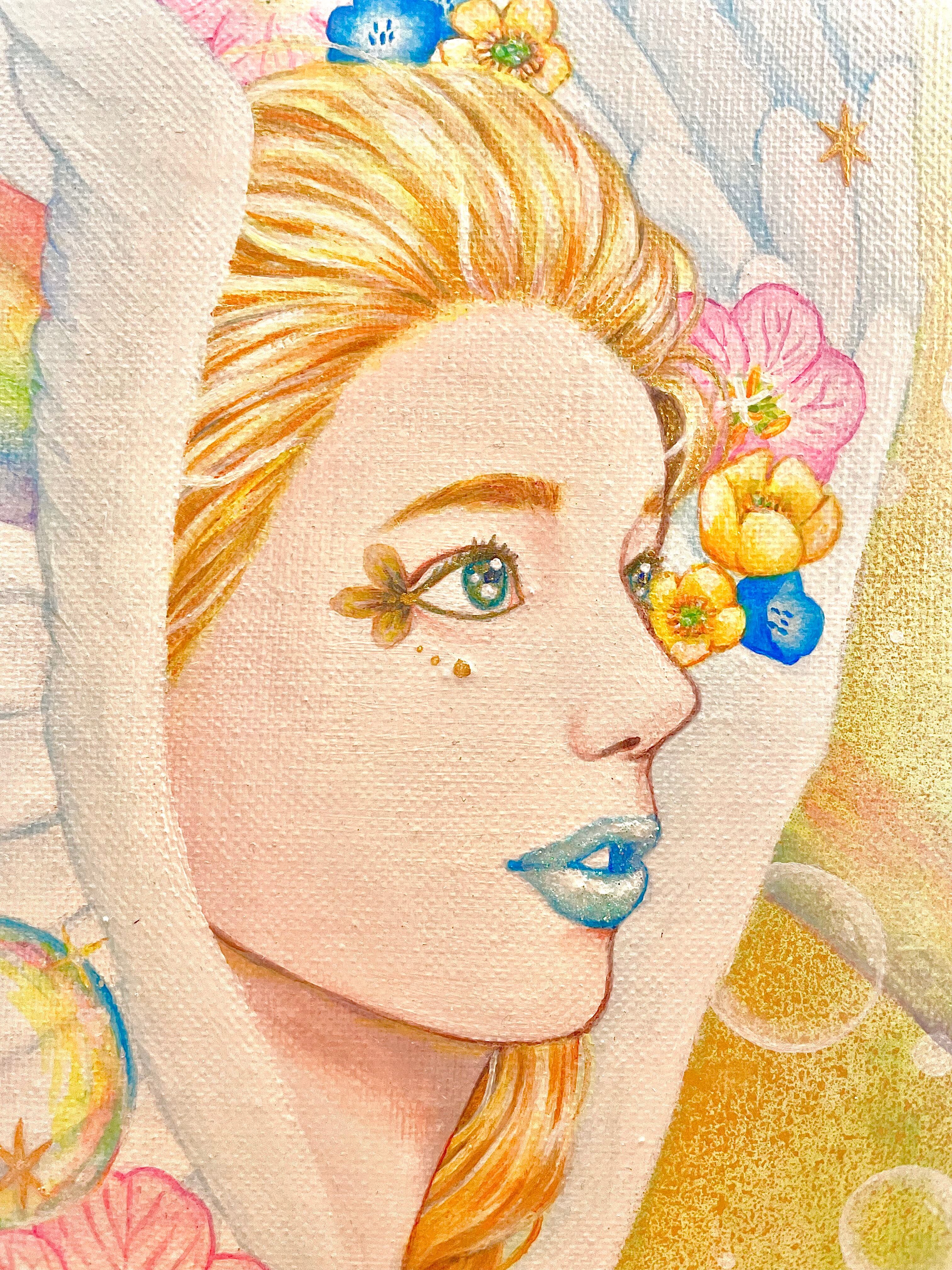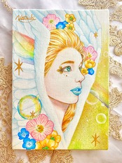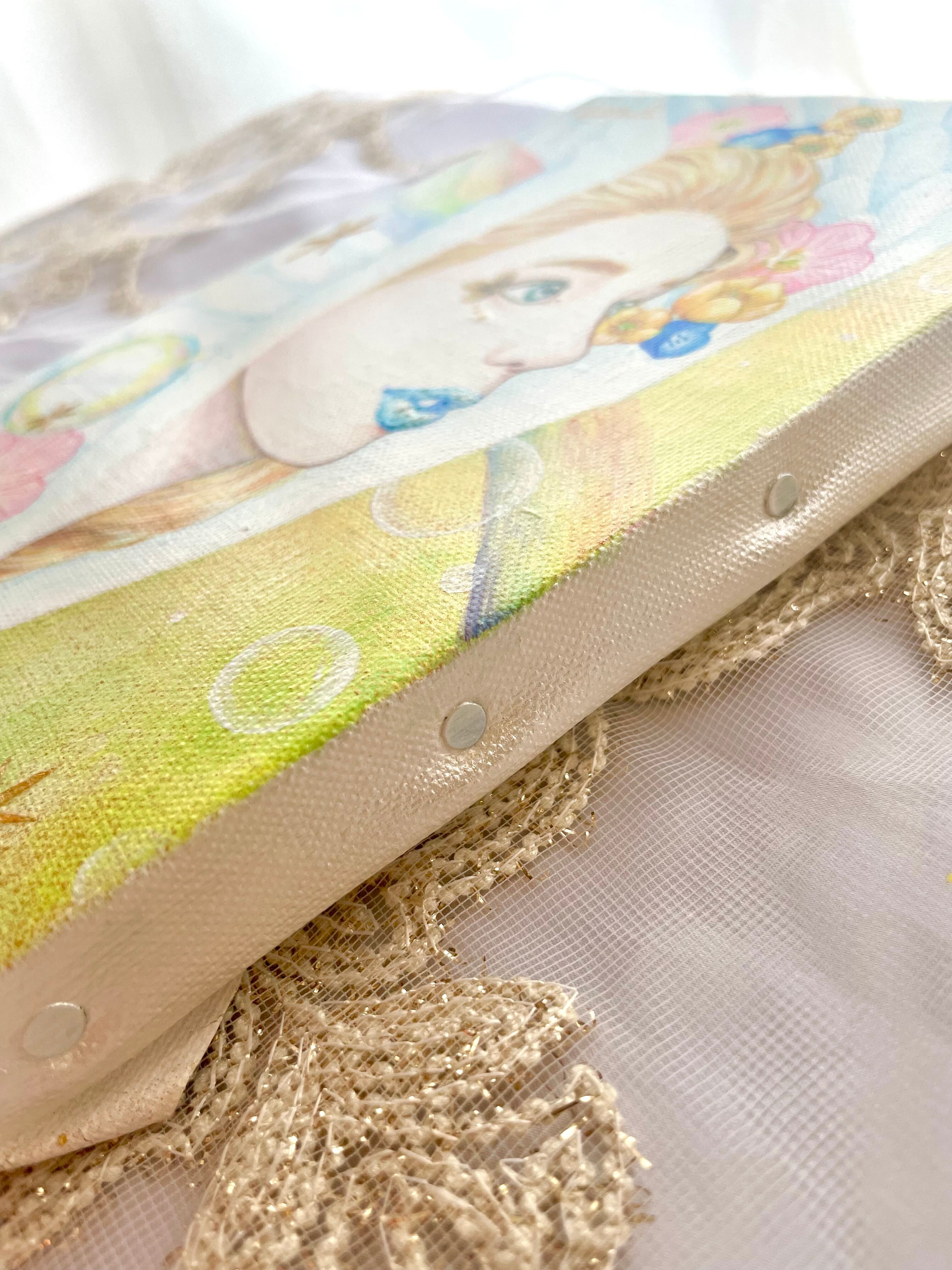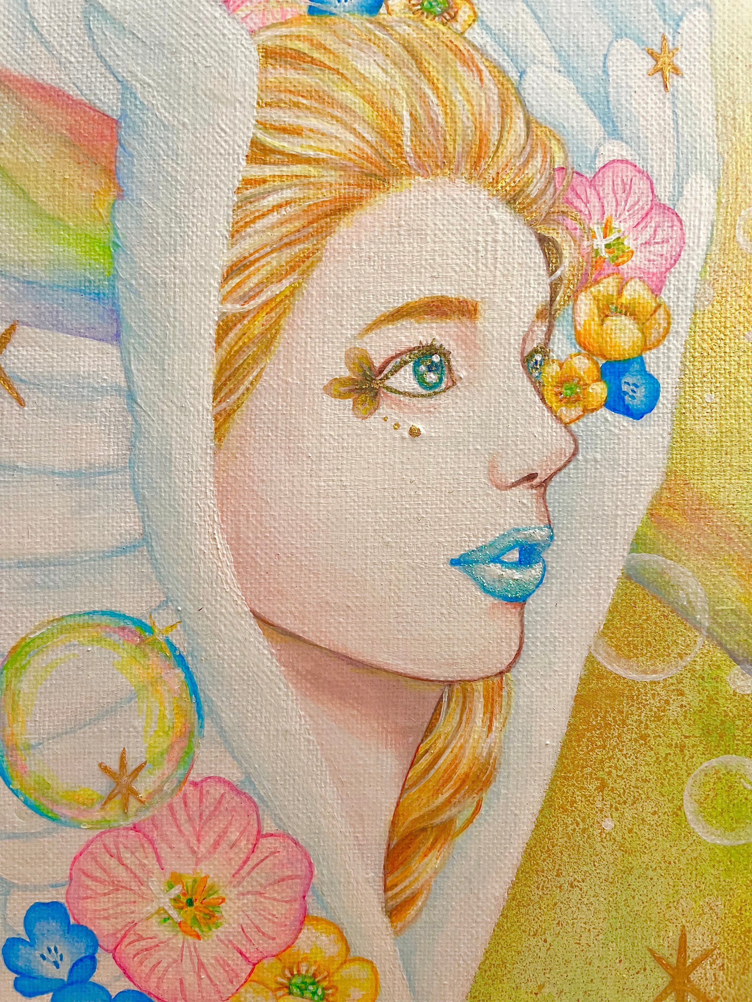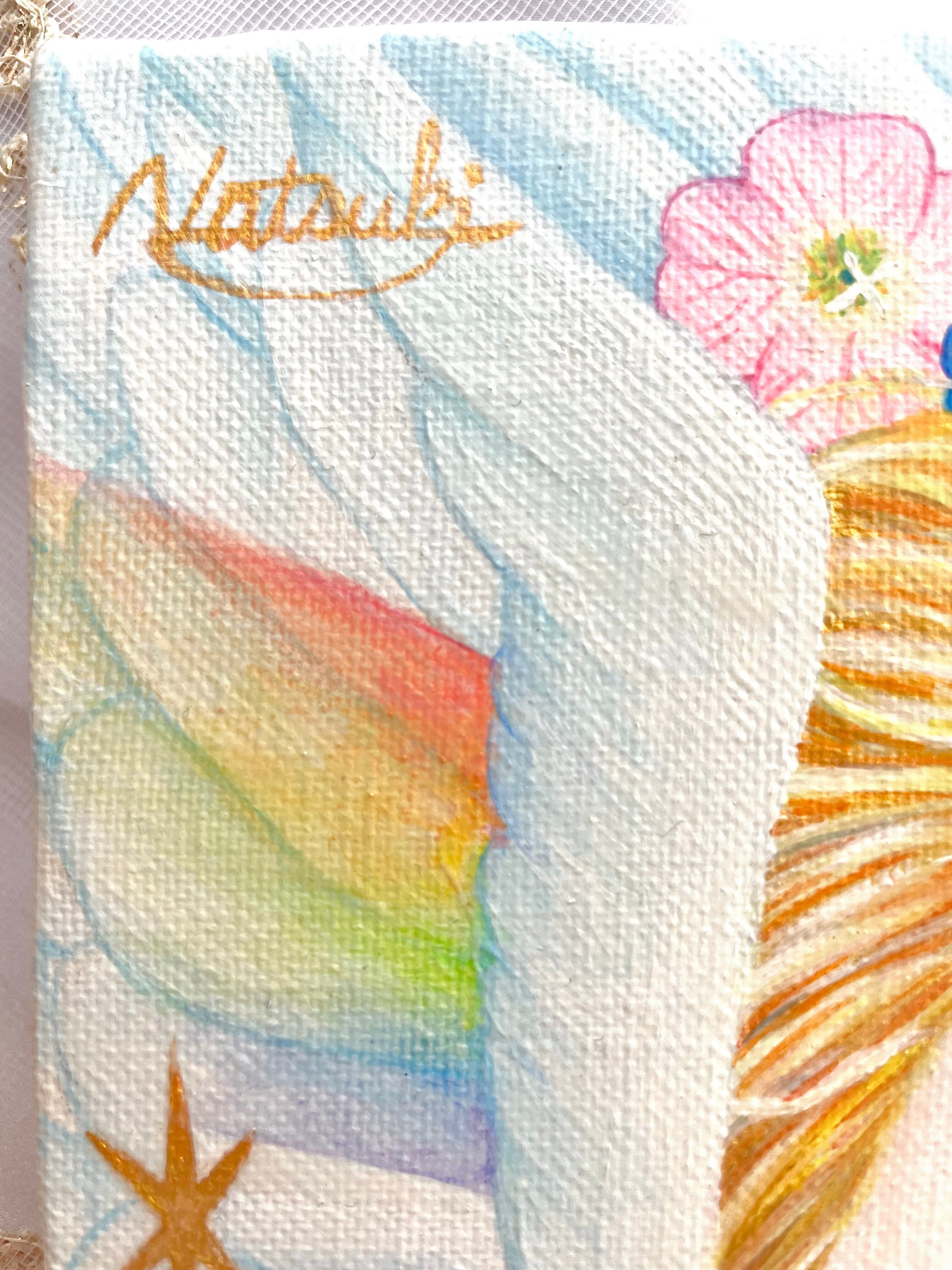 天使の周りのキラキラ✴︎にはジェルメディウムを使用しており、立体感を出しています。
