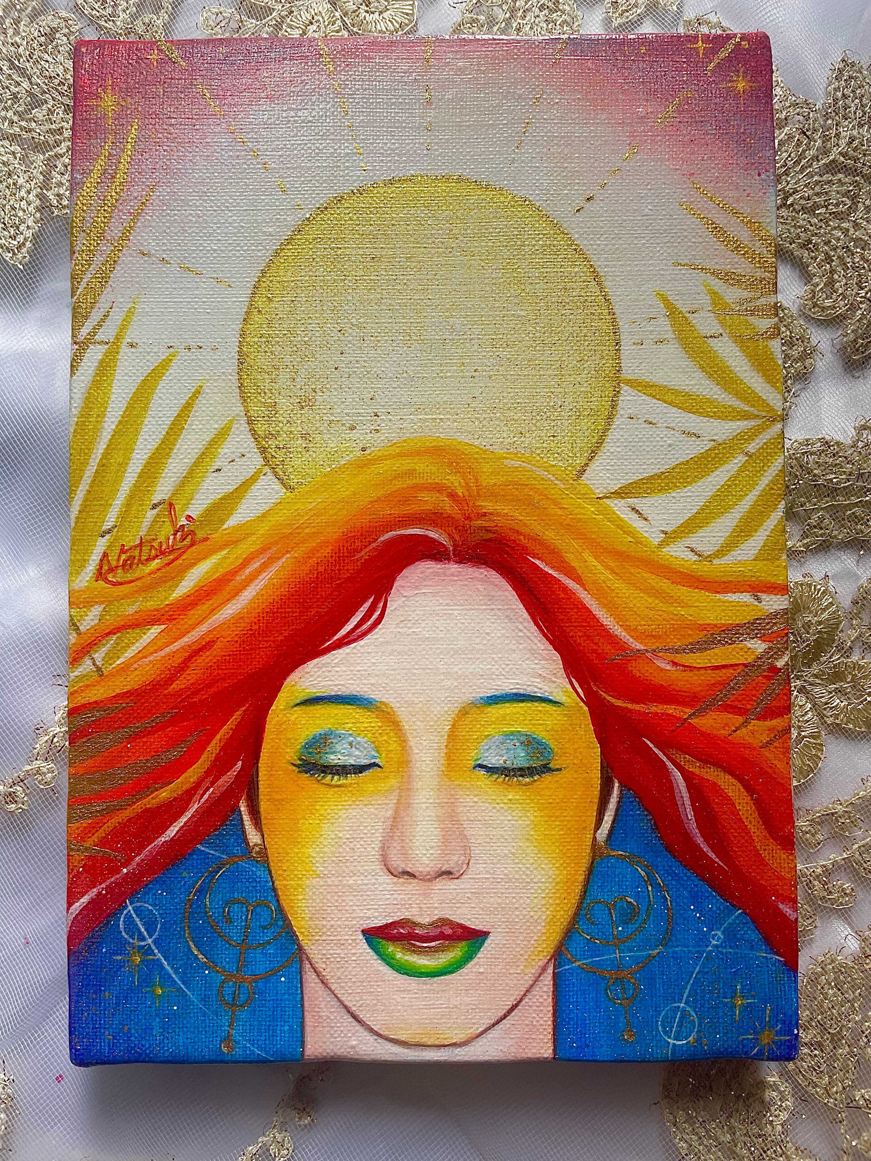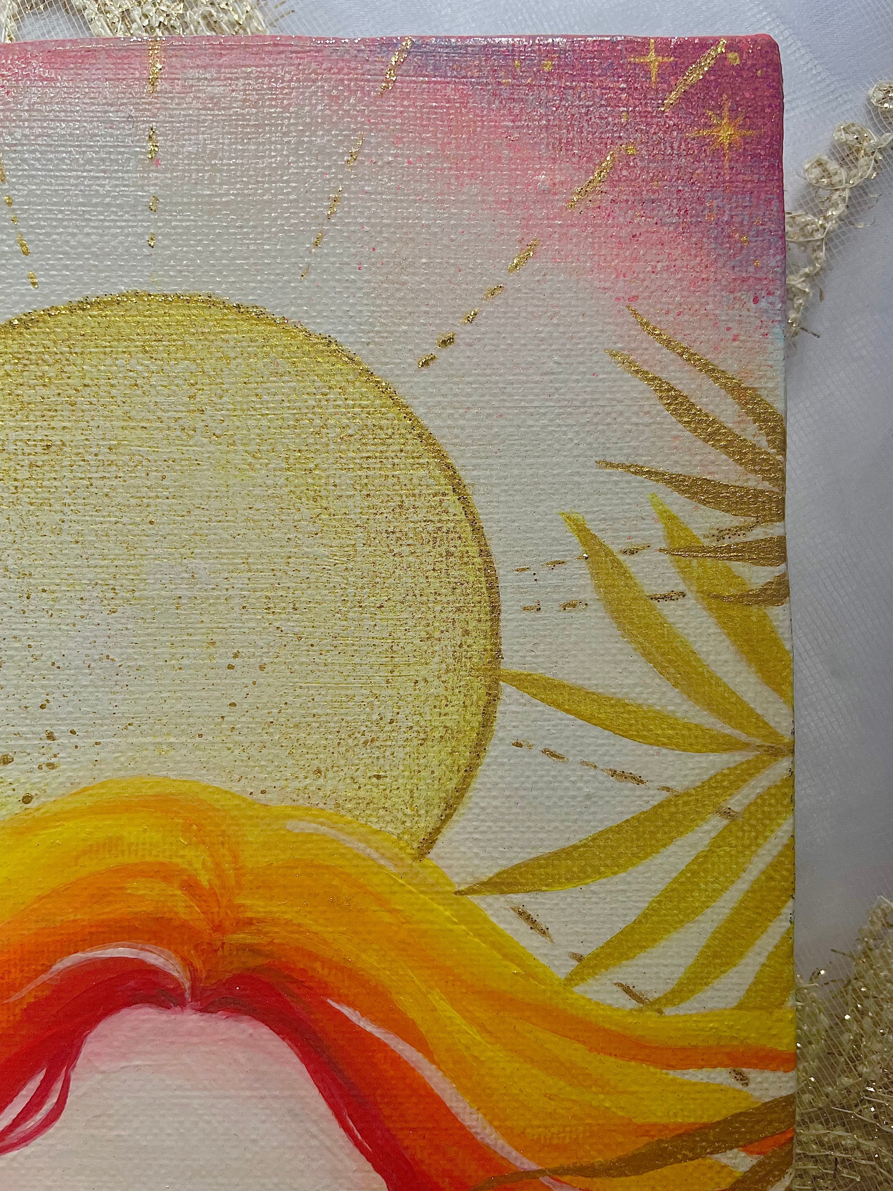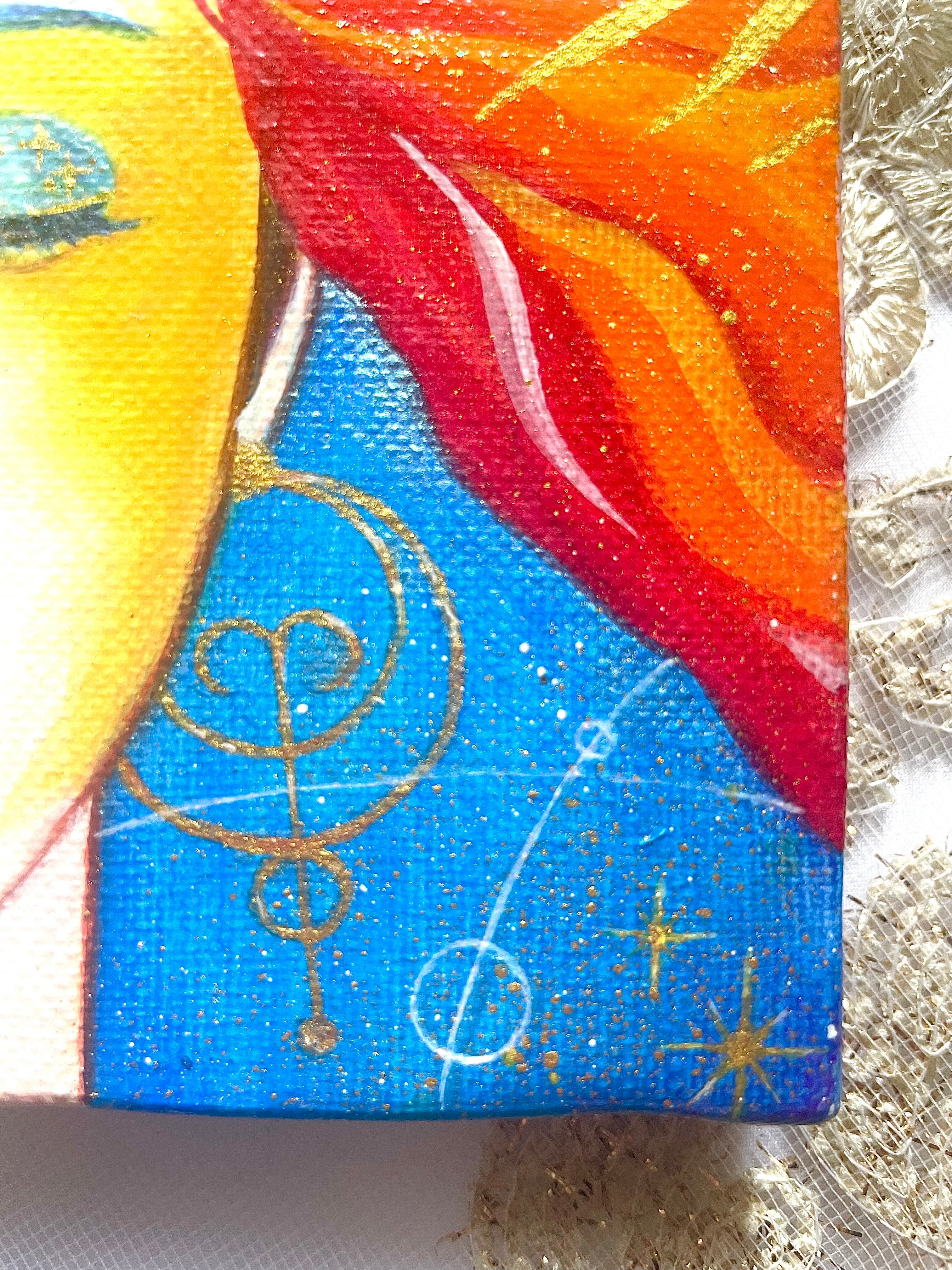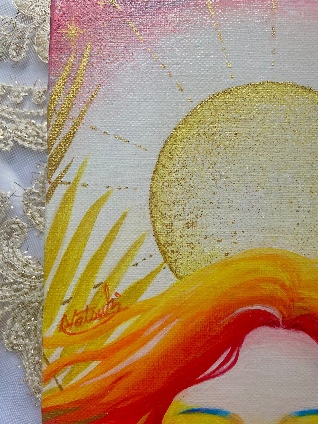 太陽の光にはグリッターが使用されており、陽の光を表現しています。