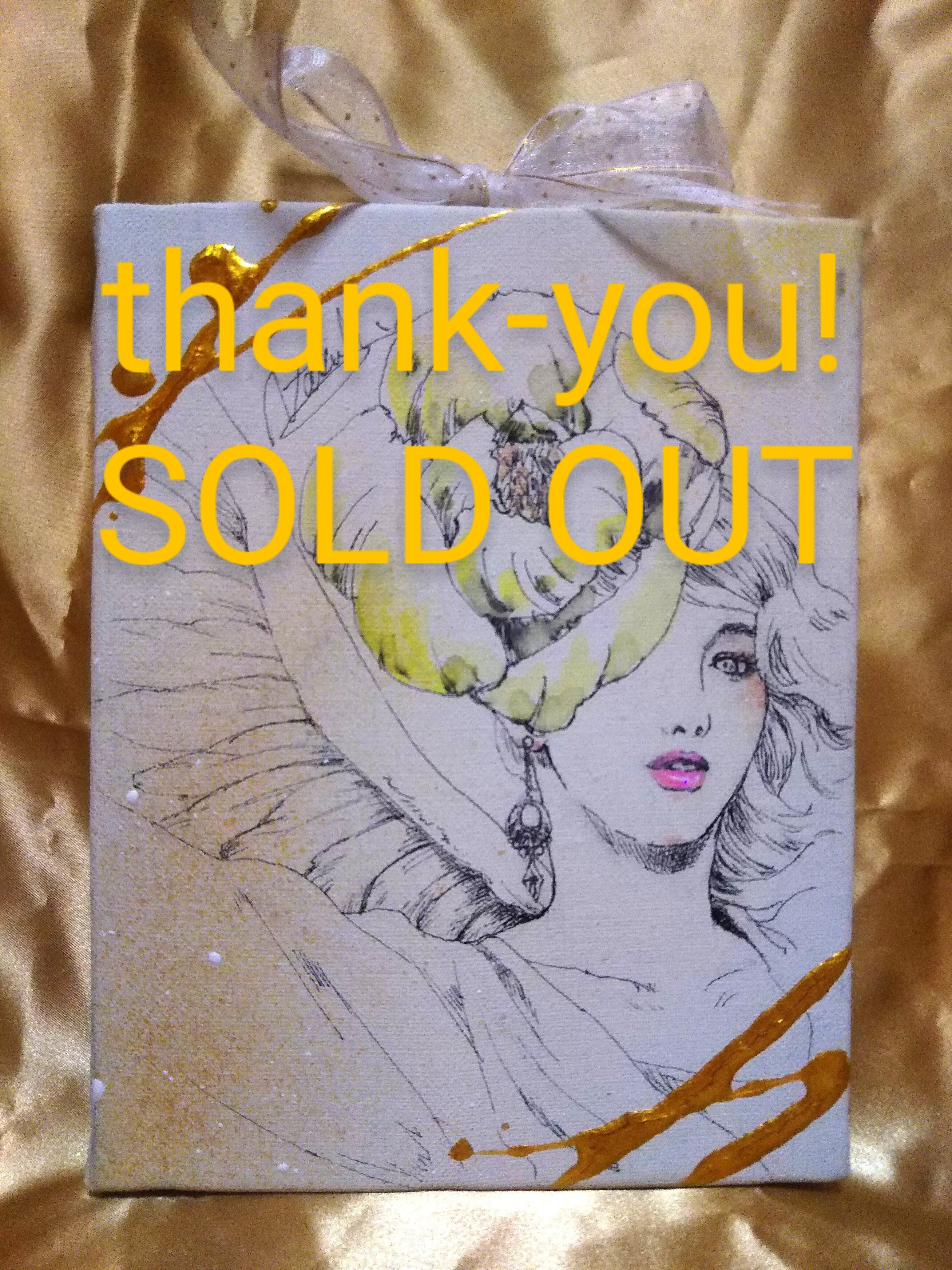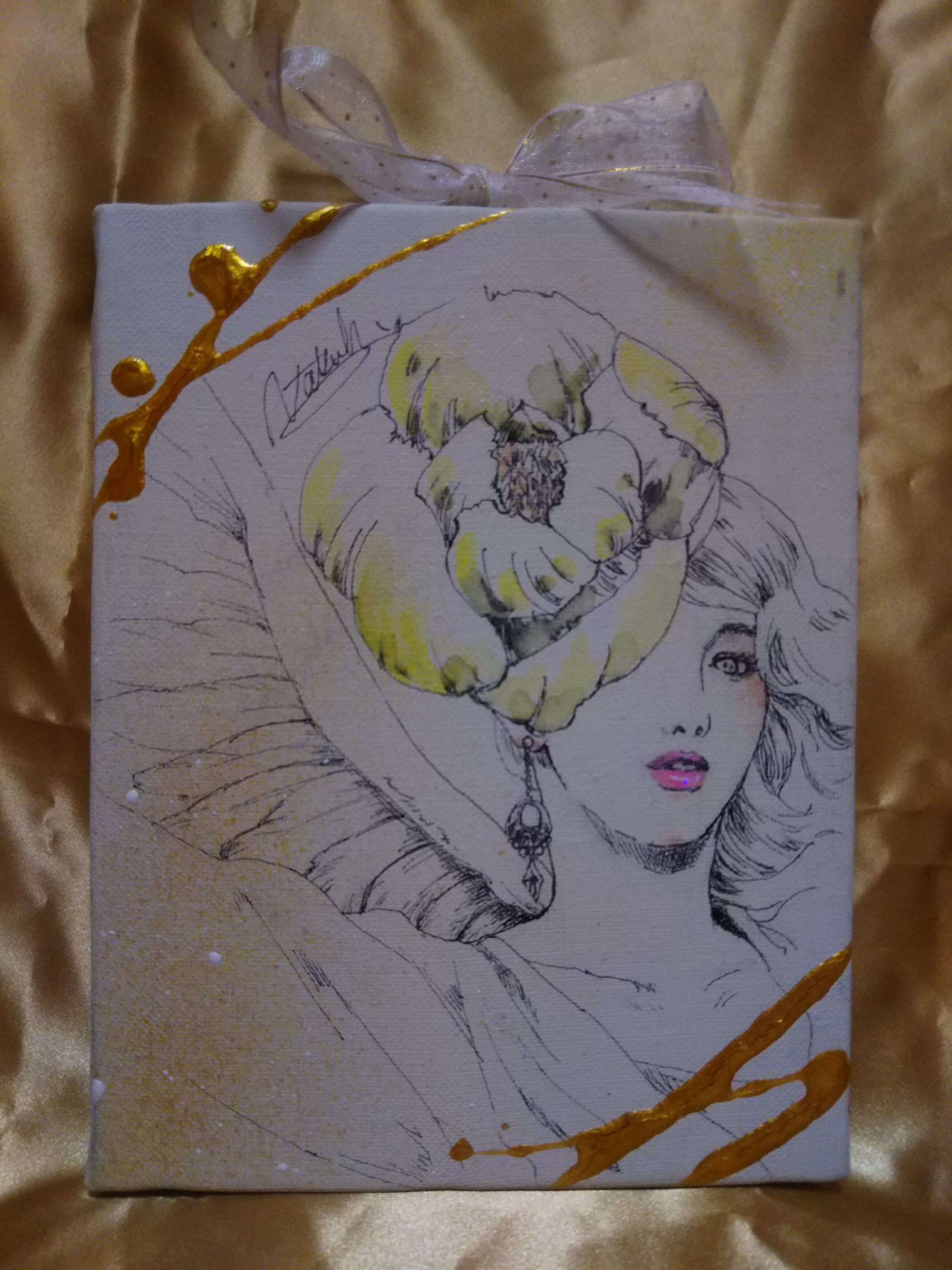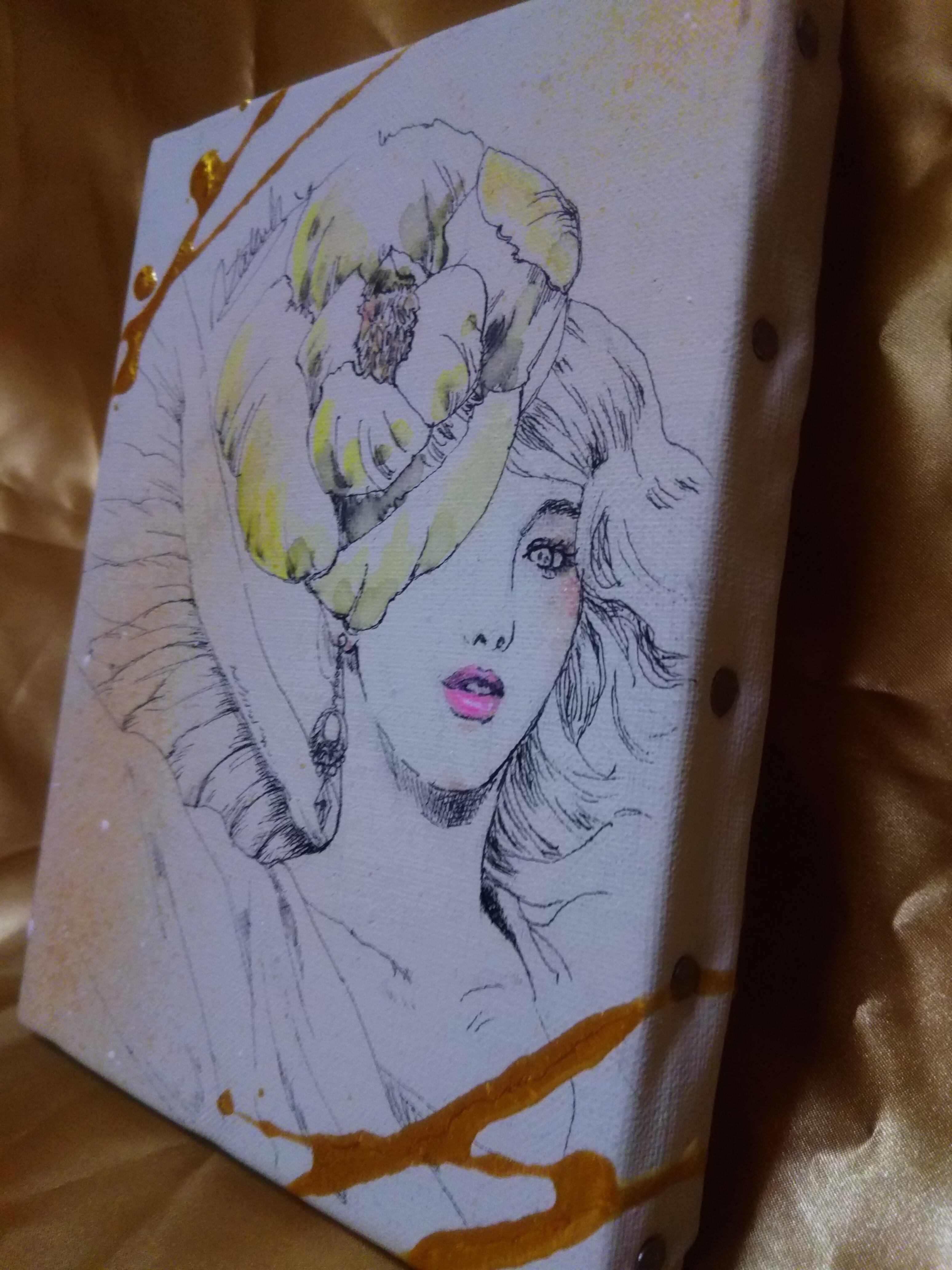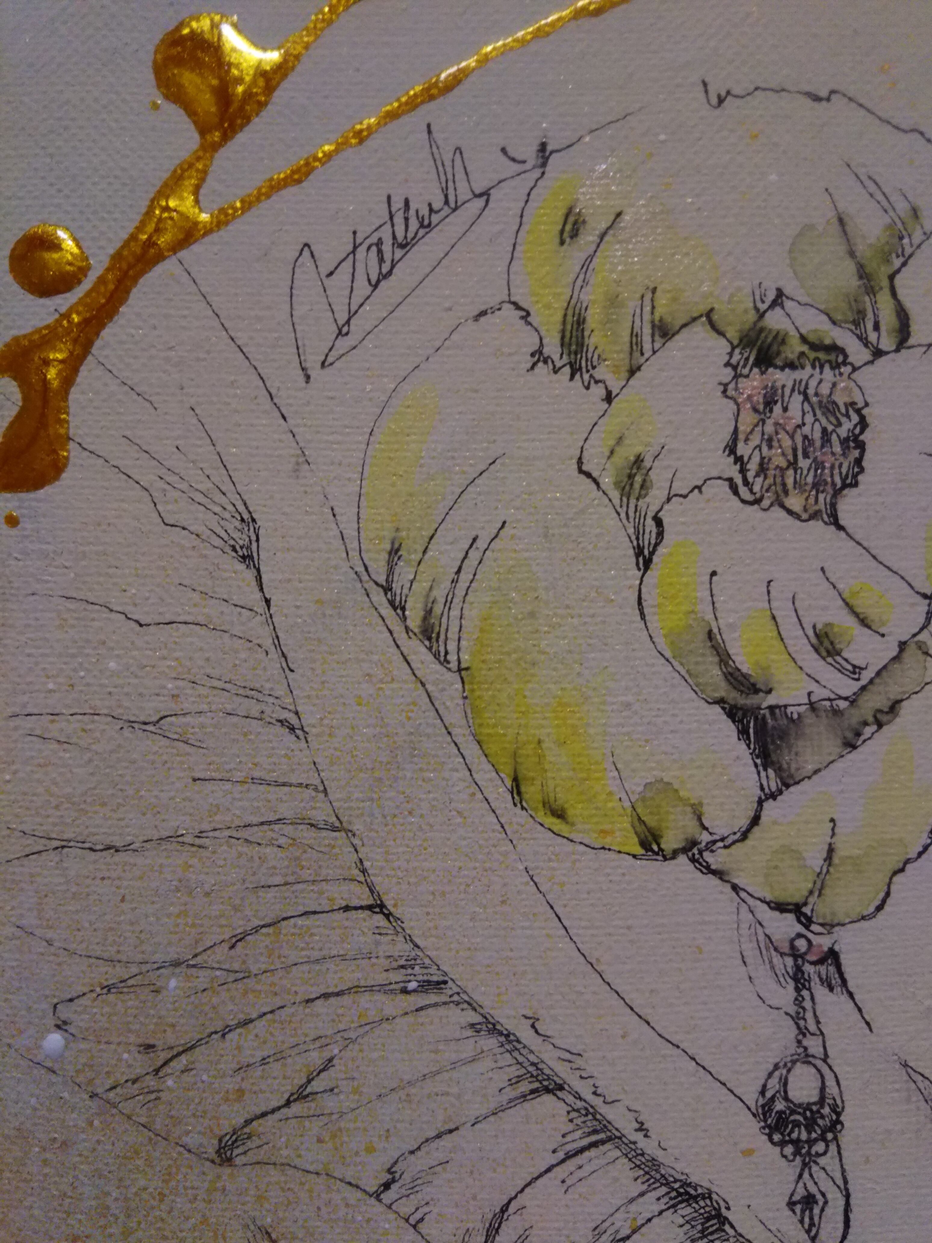 ボールペンで描いた線画に、キャンバス左上、右下には金色のアクセントを、