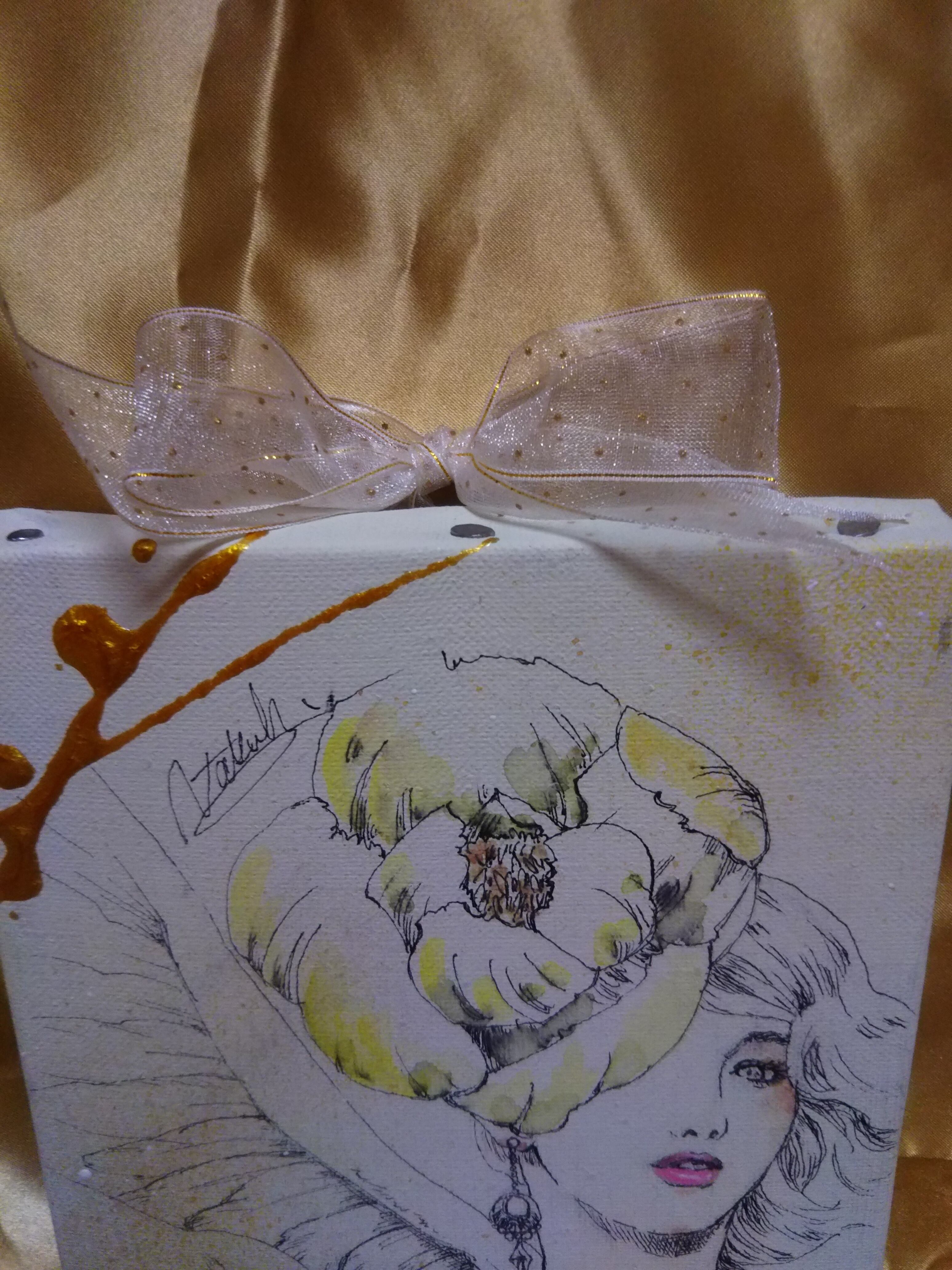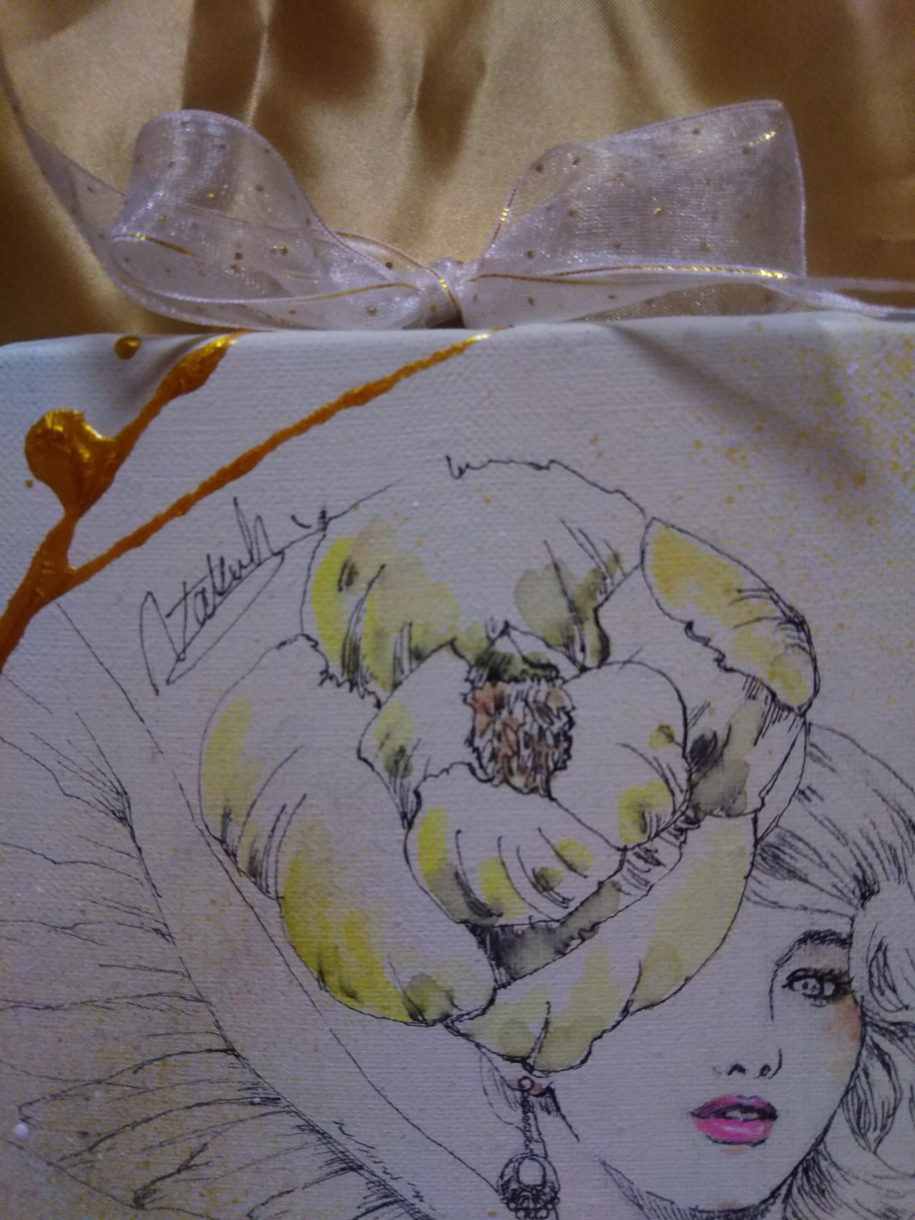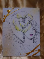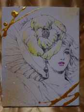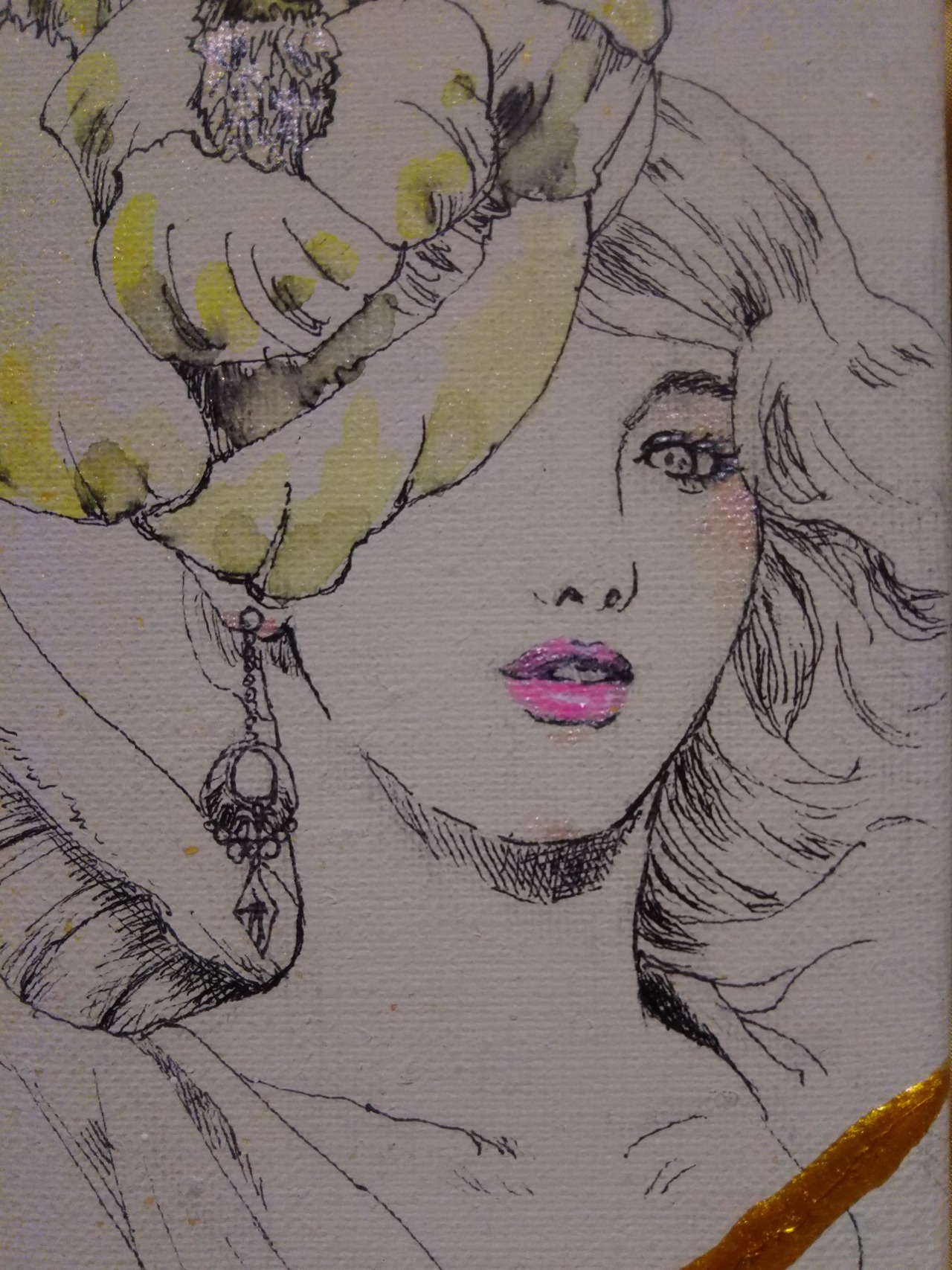 ボールペンで描いた線画に、キャンバス左上、右下には金色のアクセントを、