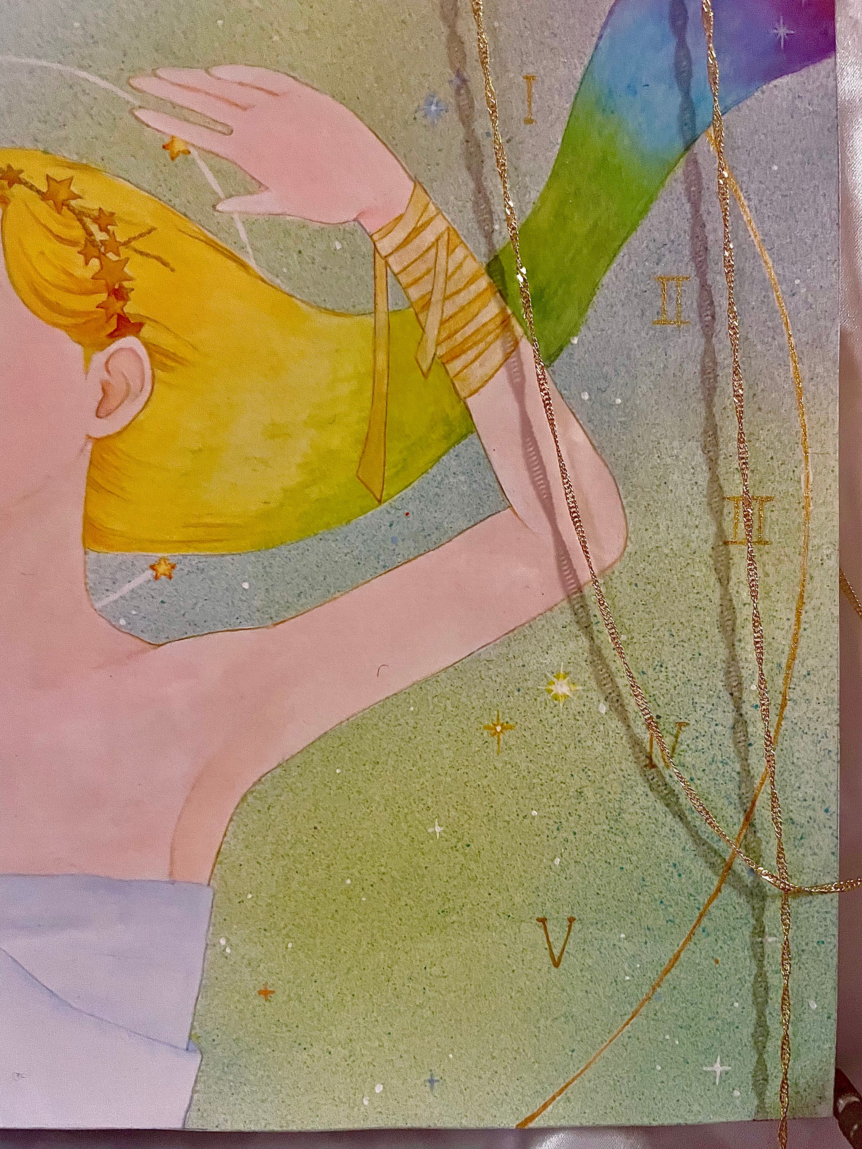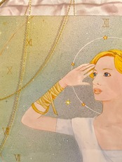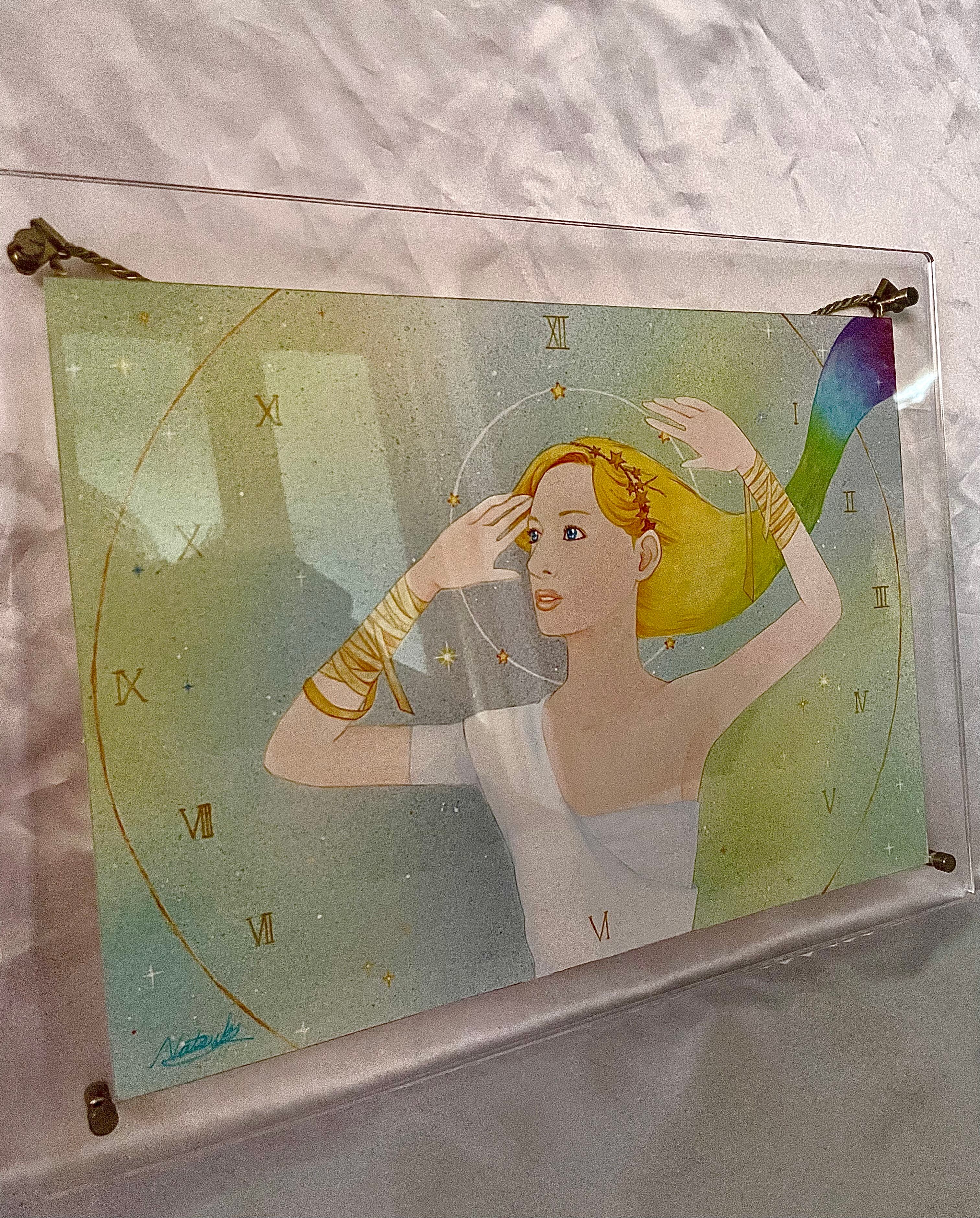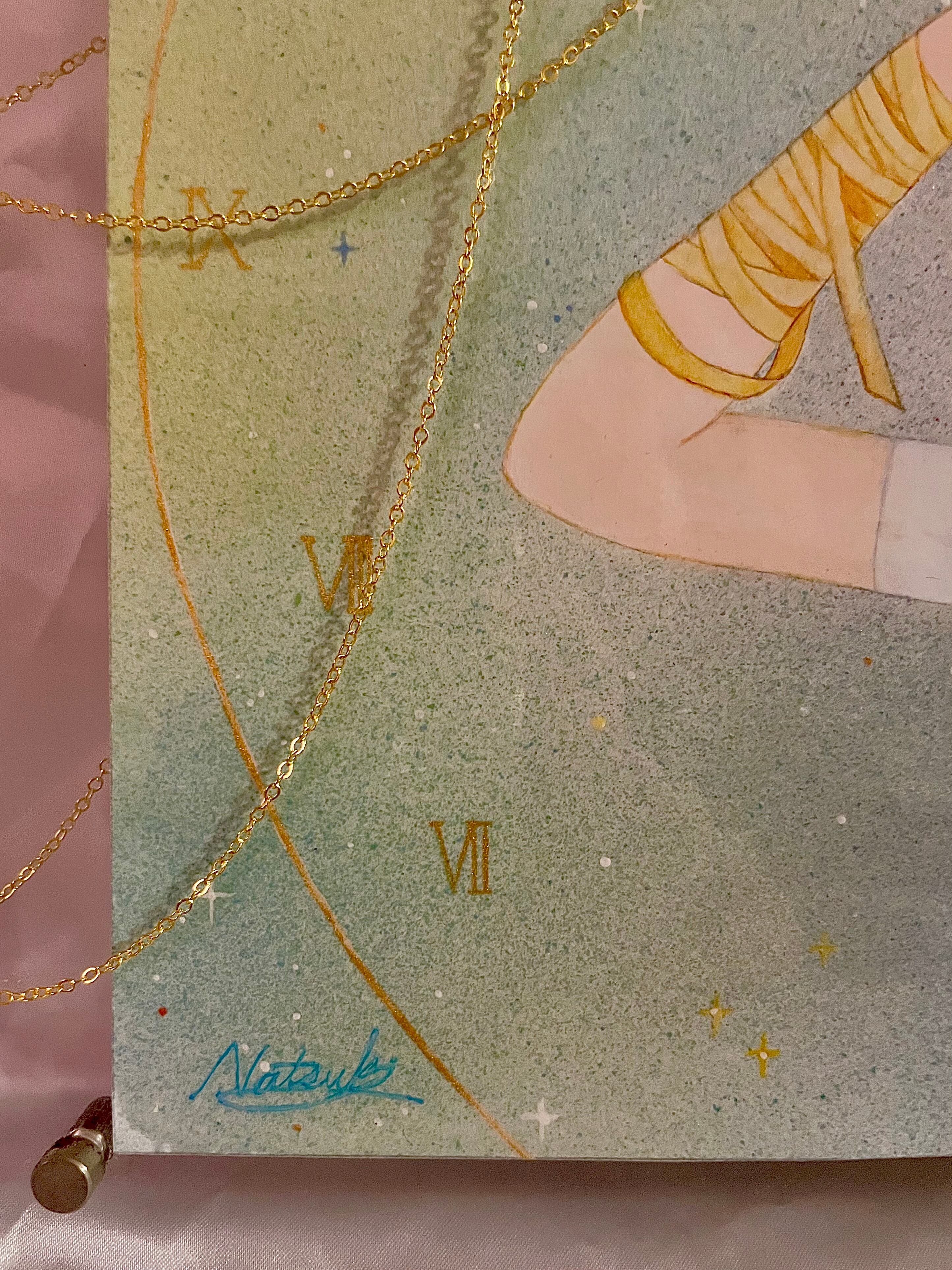 背景の時計の文字は宇宙に流れる時間のイメージとして描きました。