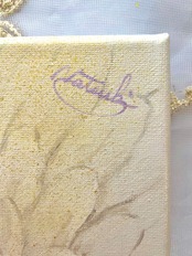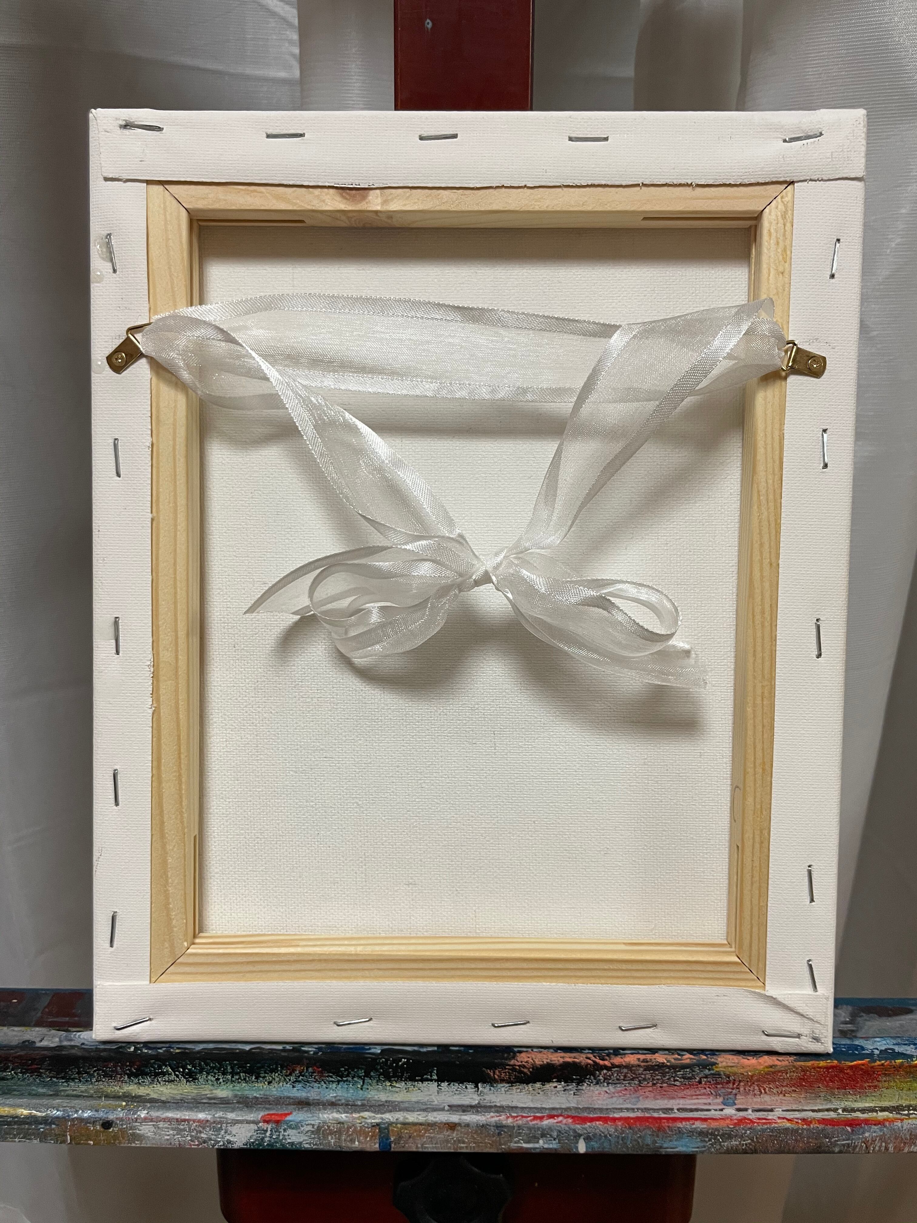 キャンバスの裏面には、作品のイメージに合わせてホワイトのリボンをつけてあります。