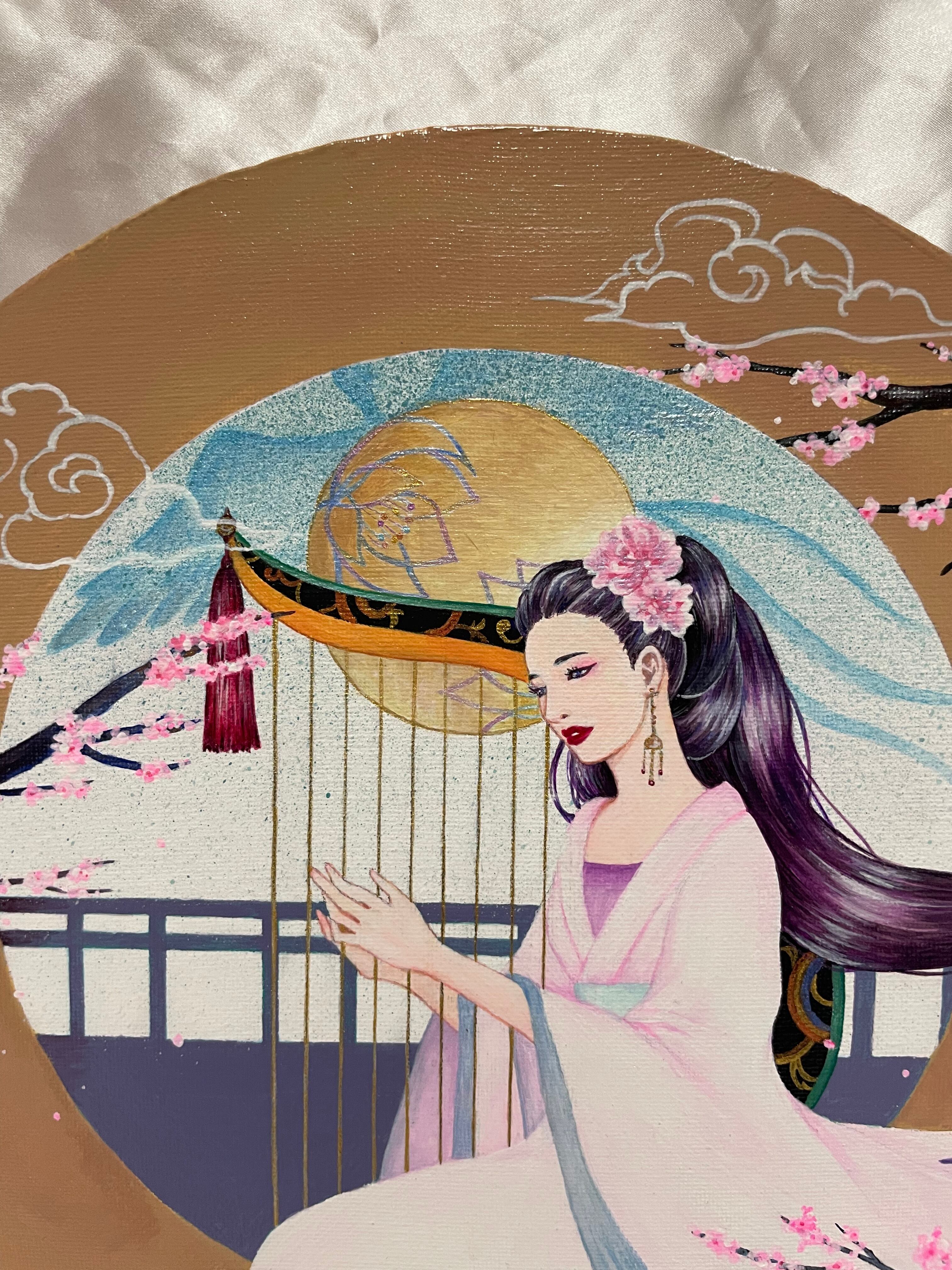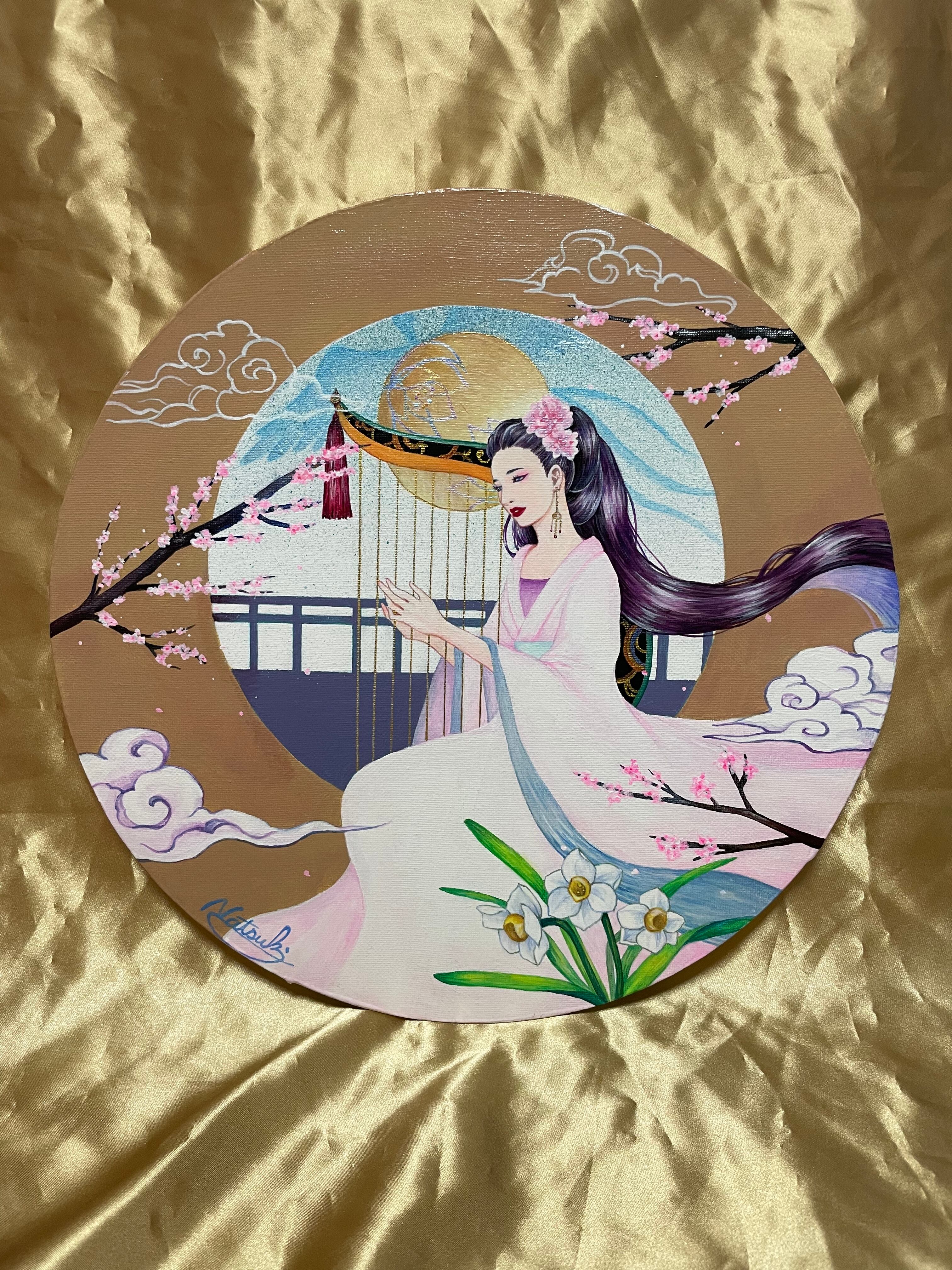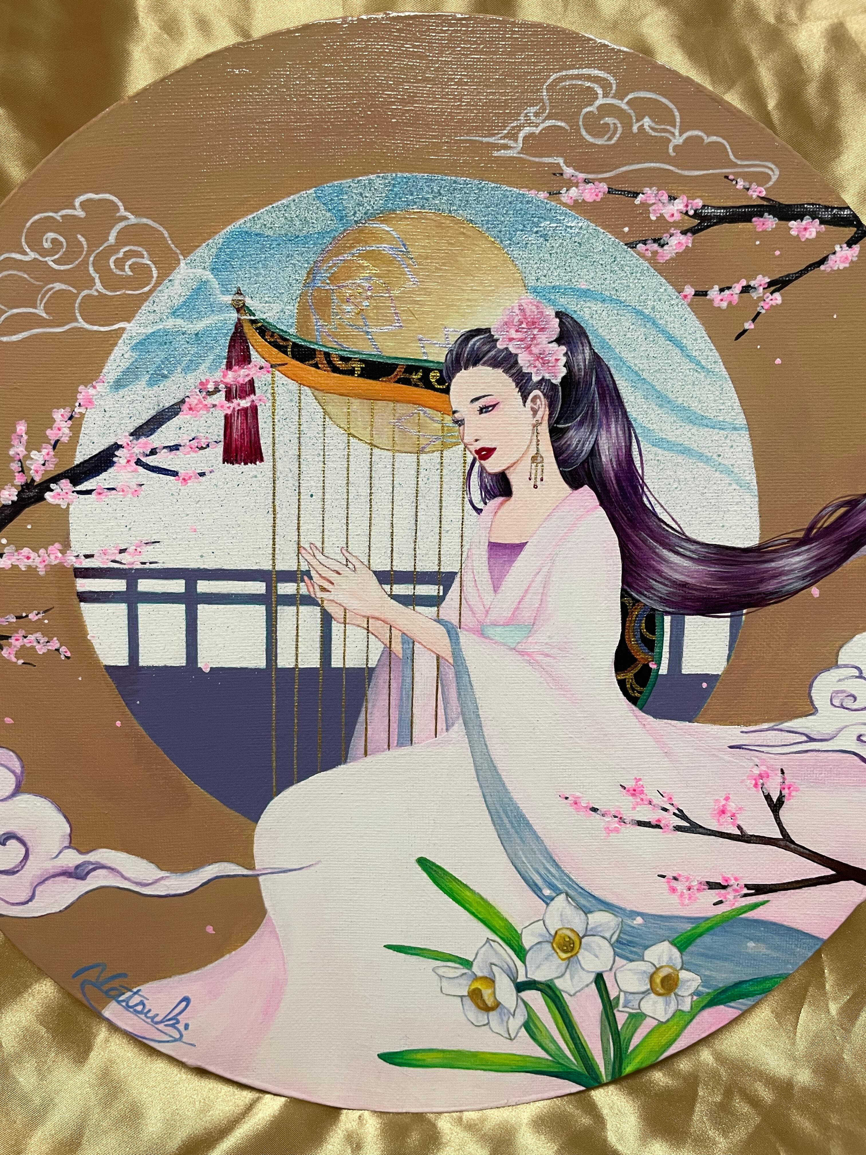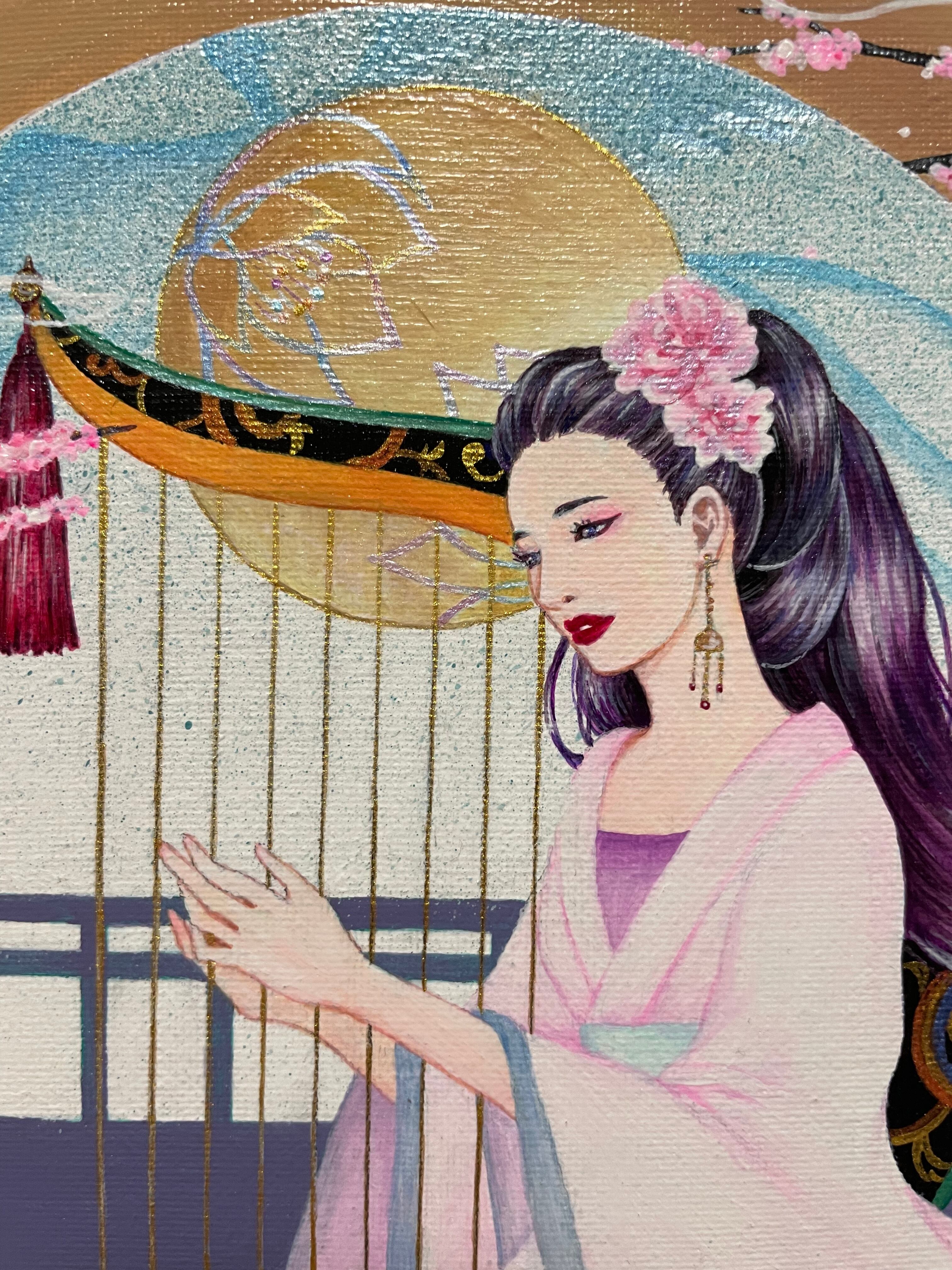 女性が弾いているのは、古代の楽器【箜篌】をイメージしたものです。
