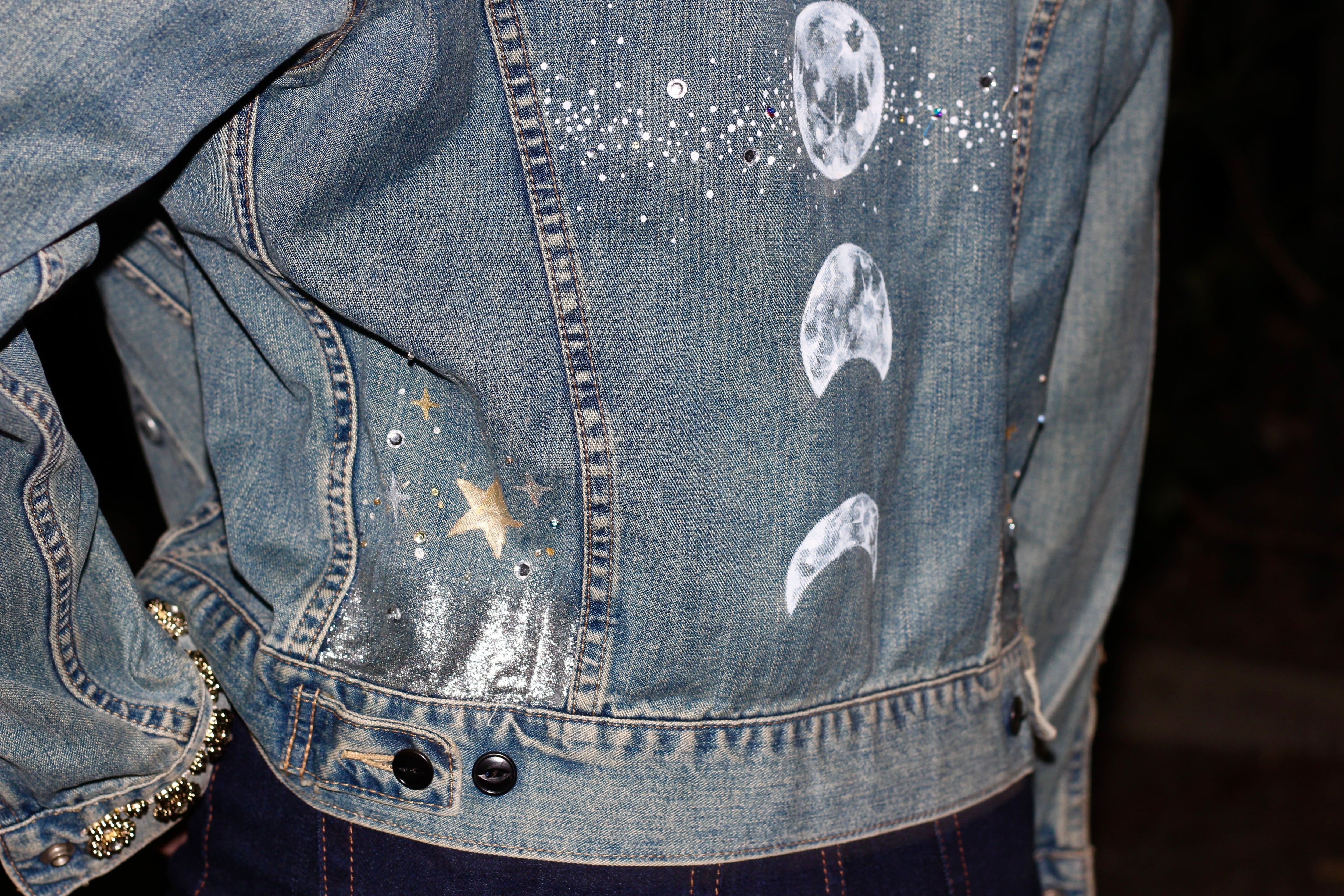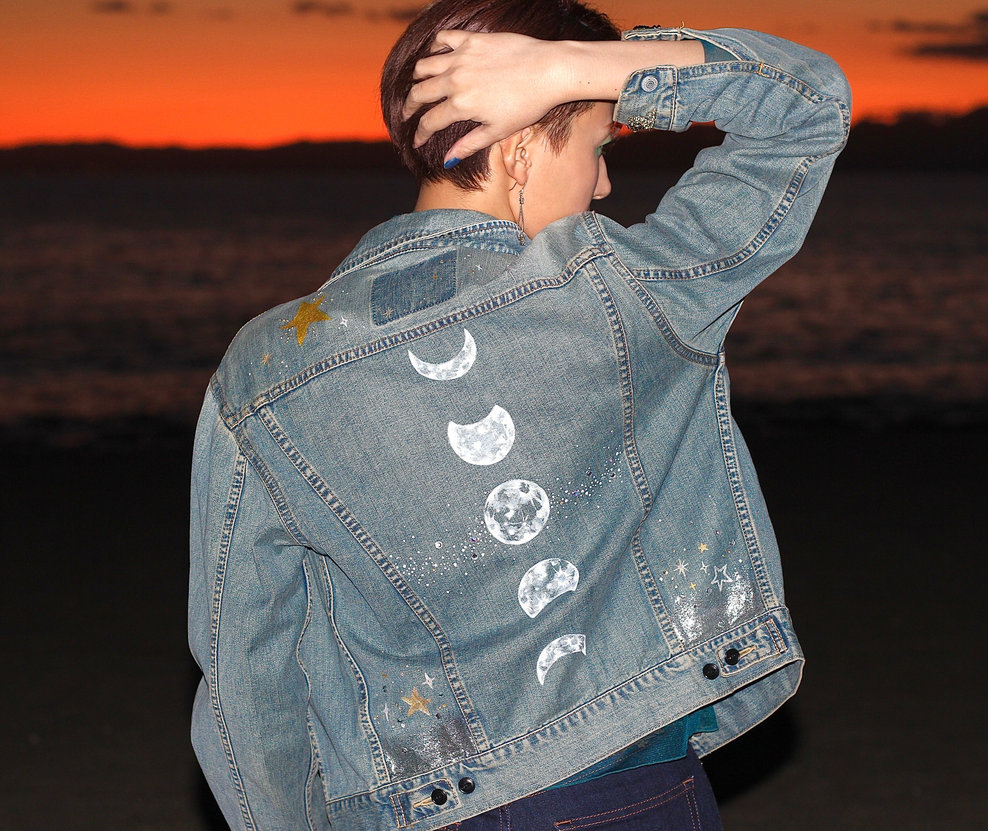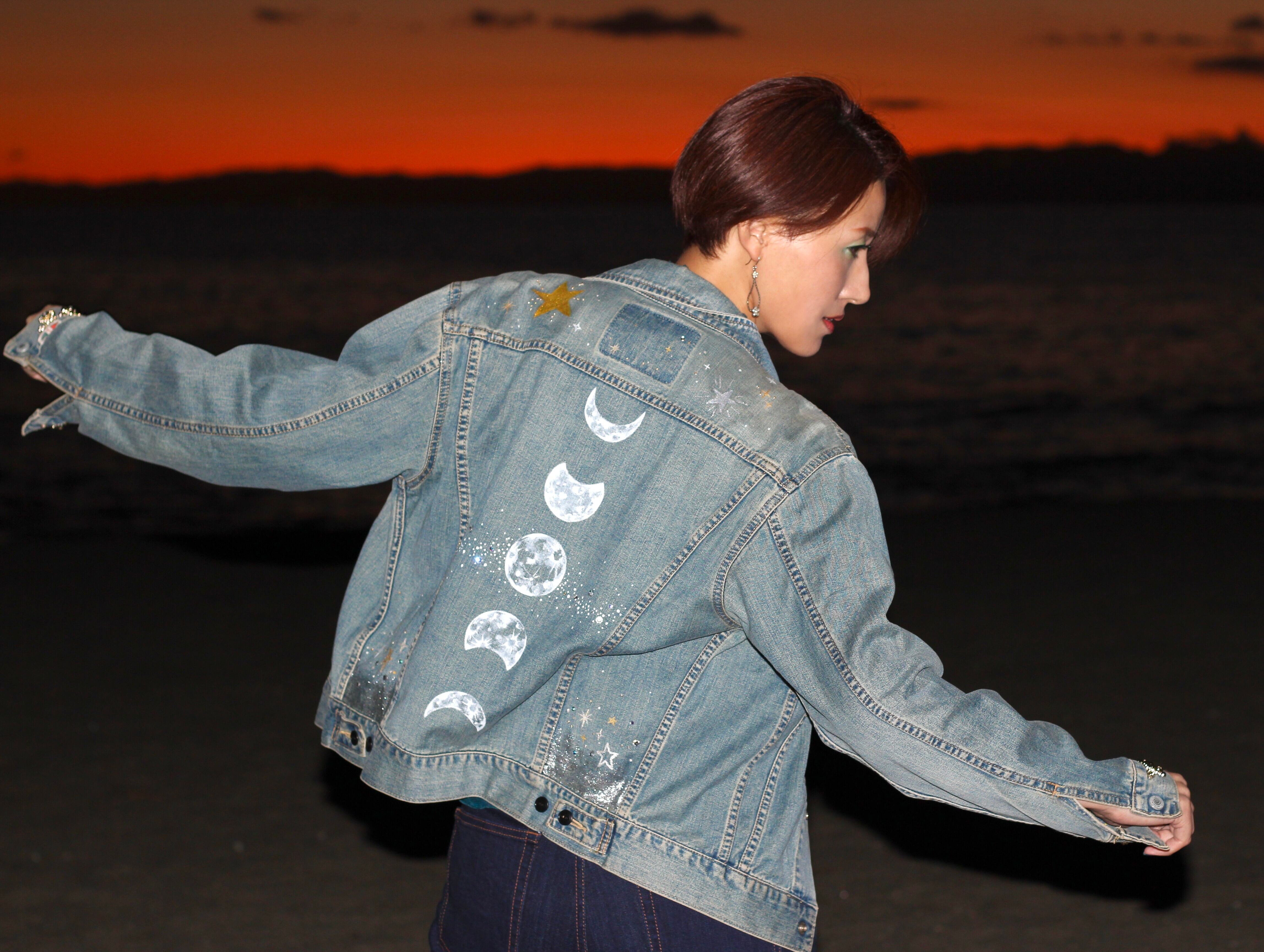 柔らかなデニムジャケットに月の満ち欠けをペイントした一枚。